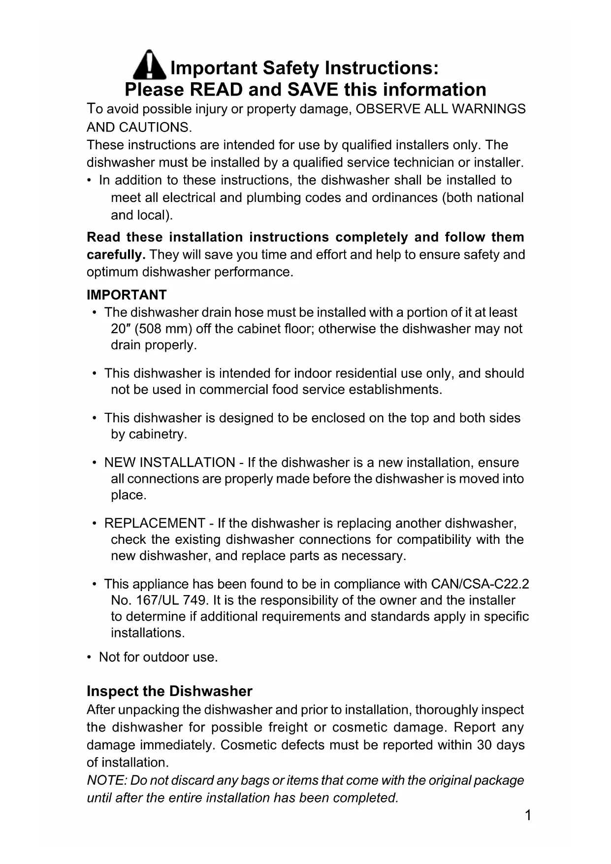 - Not for outdoor use. Inspect the Dishwasher After unpacking the dishwasher and prior to installation, thoroughly inspect the dishwasher for possible freight or cosmetic damage. Report any damage immediately. Cosmetic defects must be reported within 30 days of installation. NOTE: Do not discard any bags or items that come with the original package until after the entire installation has been completed.