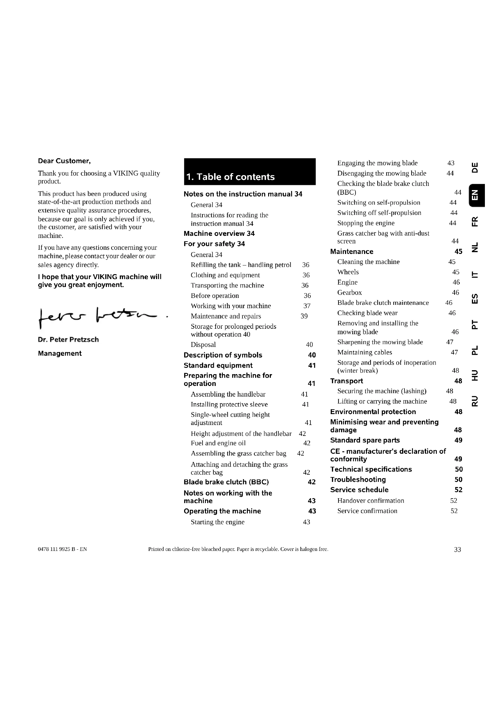 Notes on the instruction manual 34 General 34 Instructions for reading the instruction manual 34 Machine overview 34 For your safety 34 General 34 Refilling the tank – handling petrol 36 Clothing and equipment 36 Transporting the machine 36 Before operation 36 Working with your machine 37 Maintenance and repairs 39 Storage for prolonged periods without operation 40 Disposal 40 Description of symbols 40 Standard equipment 41 Preparing the machine for operation 41 Assembling the handlebar 41 Installing protective sleeve 41 Single-wheel cutting height adjustment 41 Height adjustment of the handlebar 42 Fuel and engine oil 42 Assembling the grass catcher bag 42 Attaching and detaching the grass catcher bag 42 Blade brake clutch (BBC) 42 Notes on working with the machine 43 Operating the machine 43 Starting the engine 43 Engaging the mowing blade 43 Disengaging the mowing blade 44 Checking the blade brake clutch (BBC) 44 Switching on self-propulsion 44 Switching off self-propulsion 44 Stopping the engine 44 Grass catcher bag with anti-dust screen 44 Maintenance 45 Cleaning the machine 45 Wheels 45 Engine 46 Gearbox 46 Blade brake clutch maintenance 46 Checking blade wear 46 Removing and installing the mowing blade 46 Sharpening the mowing blade 47 Maintaining cables 47 Storage and periods of inoperation (winter break) 48 Transport 48 Securing the machine (lashing) 48 Lifting or carrying the machine 48 Environmental protection 48 Minimising wear and preventing damage 48 Standard spare parts 49 CE - manufacturer's declaration of conformity 49 Technical specifications 50 Troubleshooting 50 Service schedule 52 Handover confirmation 52 Service confirmation 520478 111 9925 B - EN