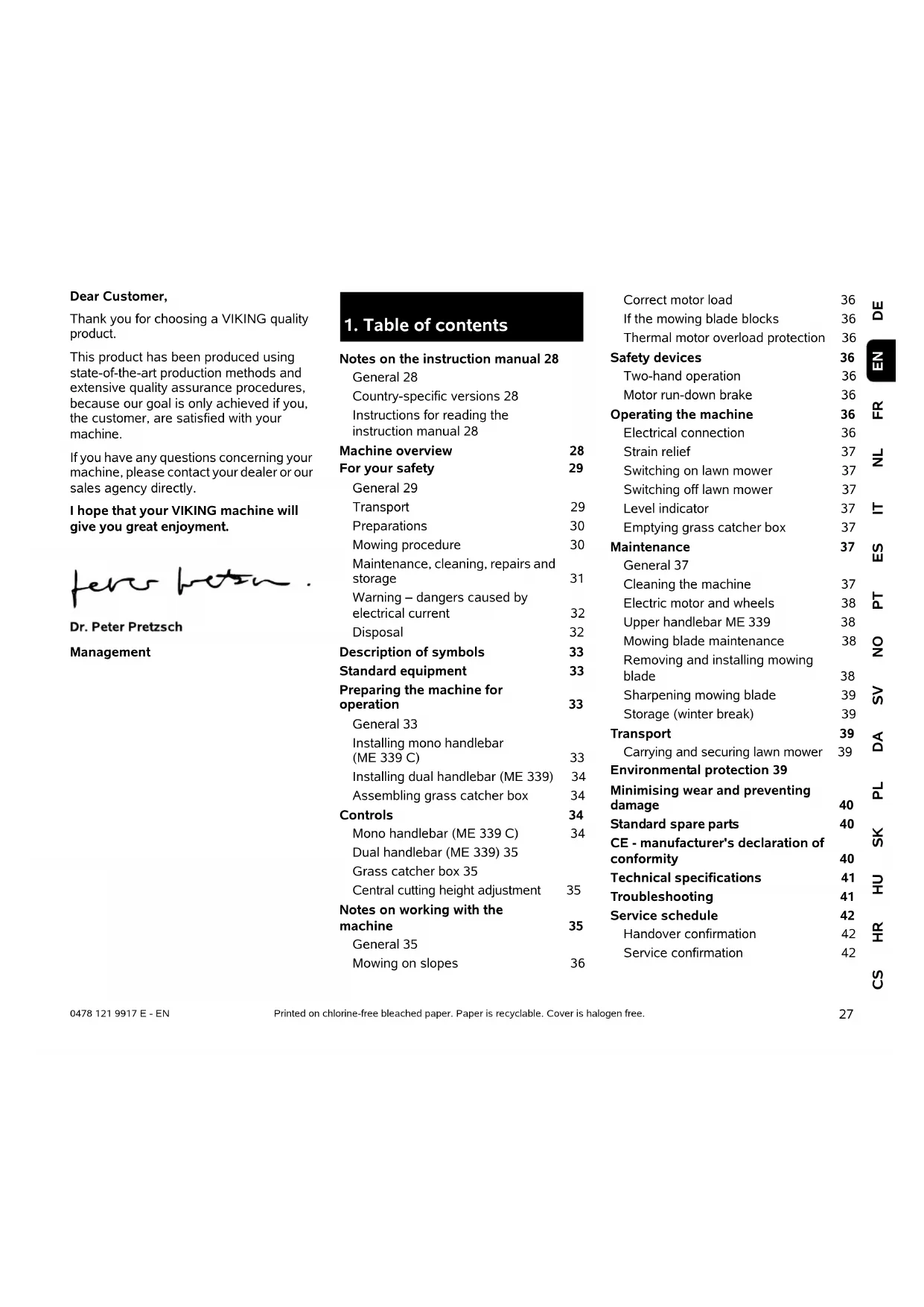 DEFRNLITESPTNOSVDAPLSKHUHRCS EN 0478 121 9917 E - EN Dear Customer, Thank you for choosing a VIKING quality product. This product has been produced using state-of-the-art production methods and extensive quality assurance procedures, because our goal is only achieved if you, the customer, are satisfied with your machine. If you have any questions concerning your machine, please contact your dealer or our sales agency directly. I hope that your VIKING machine will give you great enjoyment. Management Printed on chlorine-free bleached paper. Paper is recyclable. Cover is halogen free.