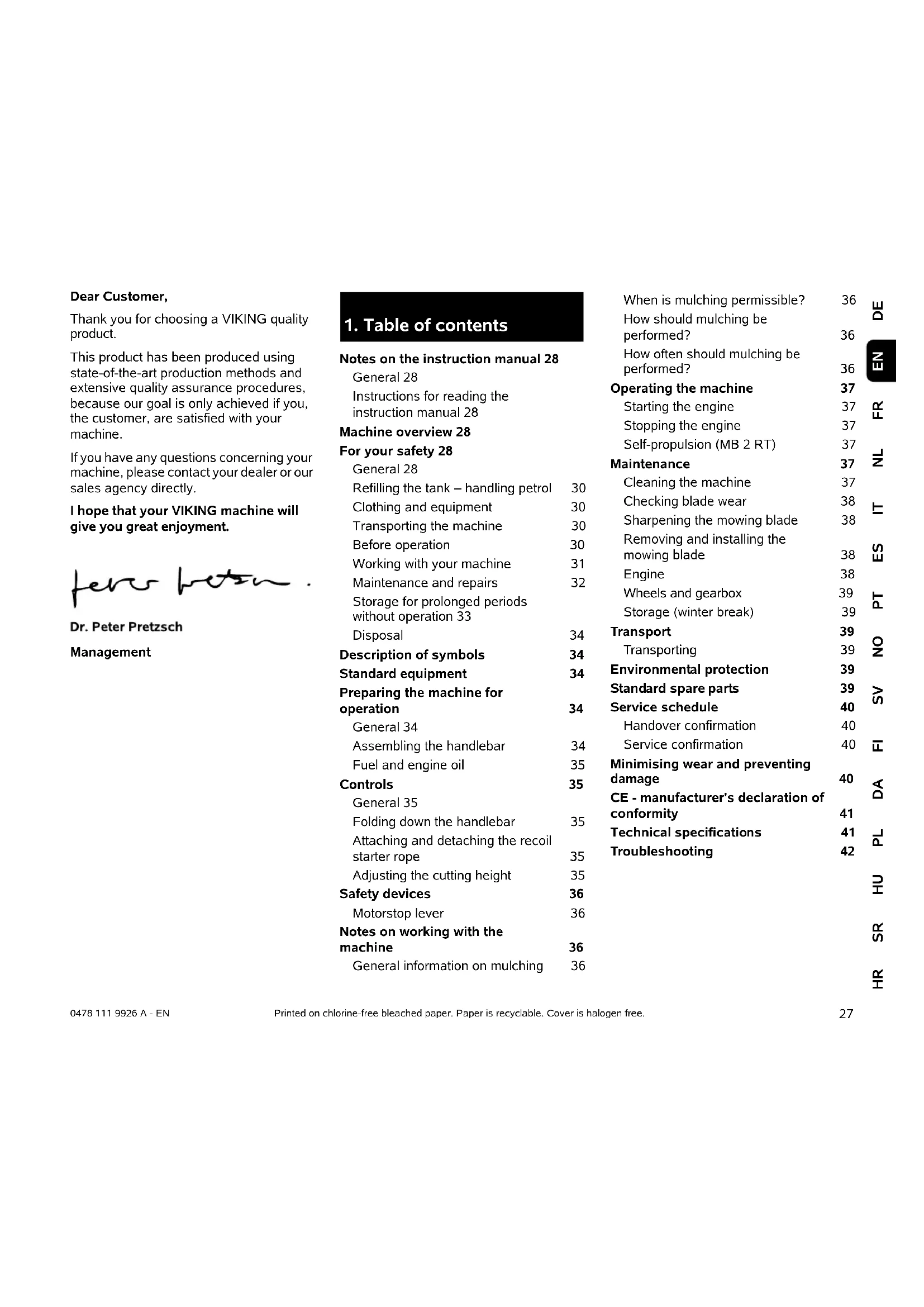 Notes on the instruction manual 28 General 28 Instructions for reading the instruction manual 28 Machine overview 28 For your safety 28 General 28 Refilling the tank – handling petrol 30 Clothing and equipment 30 Transporting the machine 30 Before operation 30 Working with your machine 31 Maintenance and repairs 32 Storage for prolonged periods without operation 33 Disposal 34 Description of symbols 34 Standard equipment 34 Preparing the machine for operation 34 General 34 Assembling the handlebar 34 Fuel and engine oil 35 Controls 35 General 35 Folding down the handlebar 35 Attaching and detaching the recoil starter rope 35 Adjusting the cutting height 35 Safety devices 36 Motorstop lever 36 Notes on working with the machine 36 General information on mulching 36 When is mulching permissible? 36 How should mulching be performed? 36 How often should mulching be performed? 36 Operating the machine 37 Starting the engine 37 Stopping the engine 37 Self-propulsion (MB 2 RT) 37 Maintenance 37 Cleaning the machine 37 Checking blade wear 38 Sharpening the mowing blade 38 Removing and installing the mowing blade 38 Engine 38 Wheels and gearbox 39 Storage (winter break) 39 Transport 39 Transporting 39 Environmental protection 39 Standard spare parts 39 Service schedule 40 Handover confirmation 40 Service confirmation 40 Minimising wear and preventing damage 40 CE - manufacturer's declaration of conformity 41 Technical specifications 41 Troubleshooting 420478 111 9926 A - EN
