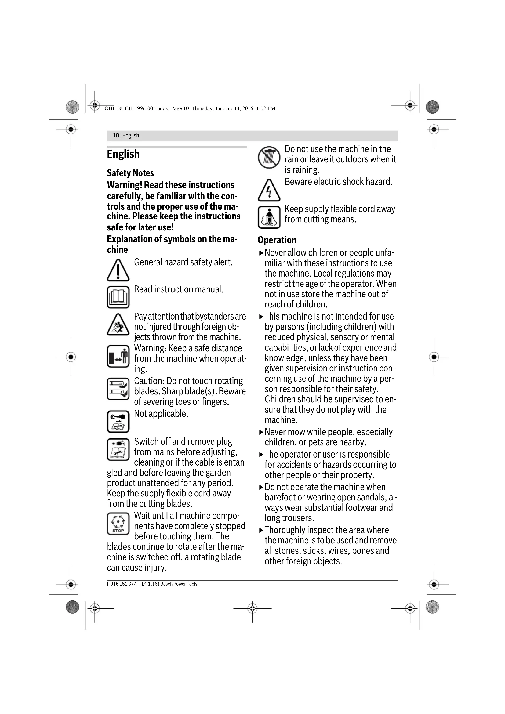 from the machine when operat- ing. Caution: Do not touch rotating blades. Sharp blade(s). Beware of severing toes or fingers. Not applicable. Switch off and remove plug from mains before adjusting, cleaning or if the cable is entan- gled and before leaving the garden product unattended for any period. Keep the supply flexible cord away from the cutting blades. Wait until all machine compo- nents have completely stopped before touching them. The blades continue to rotate after the ma- chine is switched off, a rotating blade can cause injury. Do not use the machine in the rain or leave it outdoors when it is raining. Beware electric shock hazard. Keep supply flexible cord away from cutting means. Operation Never allow children or people unfa- miliar with these instructions to use the machine. Local regulations may restrict the age of the operator. When not in use store the machine out of reach of children. This machine is not intended for use by persons (including children) with reduced physical, sensory or mental capabilities, or lack of experience and knowledge, unless they have been given supervision or instruction con- cerning use of the machine by a per- son responsible for their safety. Children should be supervised to en- sure that they do not play with the machine. Never mow while people, especially children, or pets are nearby. The operator or user is responsible for accidents or hazards occurring to other people or their property. Do not operate the machine when barefoot or wearing open sandals, al- ways wear substantial footwear and long trousers. Thoroughly inspect the area where the machine is to be used and remove all stones, sticks, wires, bones and other foreign objects. OBJ_BUCH-1996-005.book Page 10 Thursday, January 14, 2016 1:02 PMEnglish | 11 Bosch Power Tools F 016 L81 374 | (14.1.16) Before using, always visually inspect to see that the blades, blade bolts and cutter assembly are not worn or damaged. Replace worn or damaged blades and bolts in sets to preserve balance. Mow only in daylight or in good artifi- cial light. Avoid mowing in bad weather condi- tions especially when there is a risk of lightning. Avoid operating the machine in wet grass, where feasible. Walk, never run. Never operate the appliance with de- fective guards or shields, or without safety devices, for example deflec- tors and/or grass catchers in place. Always wear ear protection. Working on banks can be danger- ous. – Do not mow on excessively steep slopes. – Always be sure of your footing on slopes or wet grass. – Mow across the face of slopes – nev- er up and down. – Exercise extreme caution when changing direction on slopes. Use extreme caution when stepping back or pulling the machine towards you. Never mow by pulling the mower to- wards you. Wait until the blades stop if the ma- chine has to be tilted for transporta- tion when crossing surfaces other than grass and when transporting the machine to and from the area to be mowed. Do not tilt the machine when starting or switching on the motor, except if the machine has to be tilted for start- ing in long grass. In this case, do not tilt it more than absolutely necessary and tilt only the part which is away from the operator. Always ensure that both hands are in the operating position before returning the ma- chine to the ground. Switch on the motor according to the instructions with feet well away from rotating parts. Do not put hands or feet near or un- der rotating parts. Always stand clear of the discharge zone when operating the machine. Never pick up or carry the machine while the motor is running. Do not modify this product. Unau- thorized modifications may impair the safety of your product and may result in increased noise and vibra- tion. Regularly inspect the supply cable and any extension cables. Do not con- nect damaged cables to the supply or touch a damaged cable before it is disconnected from the supply. A damaged cable can lead to contact with live parts. Beware electric shock hazard. Remove the plug from the socket: – Whenever you leave the machine. – before clearing a blockage, – before checking, cleaning or working on the machine, OBJ_BUCH-1996-005.book Page 11 Thursday, January 14, 2016 1:02 PM12 | English F 016 L81 374 | (14.1.16) Bosch Power Tools – after striking a foreign object. Inspect the machine for damage and make re- pairs as necessary, – if the machine starts to vibrate abnor- mally (check immediately). Connecting to the mains The voltage indicated on the rating plate must correspond to the voltage of the power source. We recommend that this equipment is only connected into a socket which is protected by a circuit-breaker that would be actuated by a 30 mA residu- al current. Only use or replace power supply ca- bles for this unit which correspond to the types indicated by the manufac- turer. See the operating instructions for the order no. and types. Never touch the mains plug with wet hands. Do not run over, crush or pull the power supply cord or extension cord, otherwise it may be damaged. Pro- tect the cable from heat, oil and sharp edges. The extension lead must have a cross section in accordance with the oper- ating instructions and be protected against splashed water. The connec- tion must not be in water. Always wear gardening gloves when handling or working near the sharp blades. Electrical Safety Warning! Switch off, remove plug from mains before adjusting, cleaning or if cable is cut, damaged or entangled. The blades continue to rotate for a few seconds after the machine is switched off. Caution – do not touch the rotating blade. Your machine is double insulated for safety and requires no earth connec- tion. The operating voltage is 230 V AC, 50 Hz (for non-EU countries 220 V, 240 V as applicable). Only use ap- proved extension cables. Contact your Bosch Service Centre for details. Extension cords/leads should only be used if they comply with H05VV-F, H05RN-F types or IEC type desi