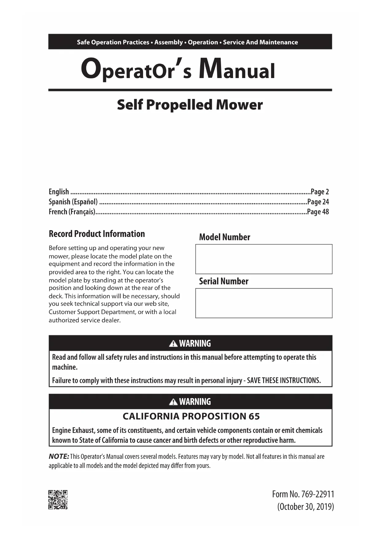 NOTE: This Operator's Manual covers several models. Features may vary by model. Not all features in this manual are applicable to all models and the model depicted may differ from yours.
