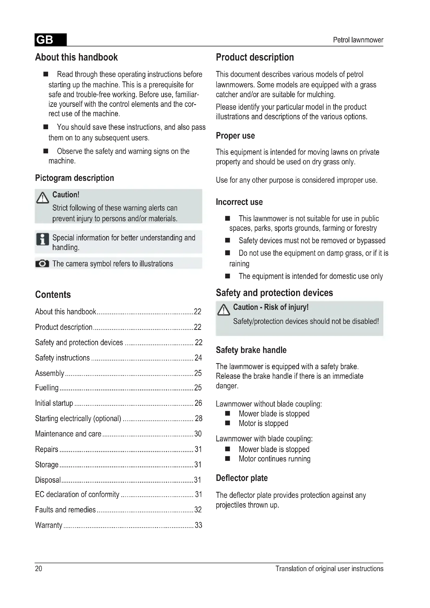- Warranty About this handbook Read through these operating instructions before starting up the machine. This is a prerequisite for safe and trouble-free working. Before use, familiar- ize yourself with the control elements and the cor- rect use of the machine. You should save these instructions, and also pass them on to any subsequent users. Observe the safety and warning signs on the machine. Pictogram description Caution! Strict following of these warning alerts can prevent injury to persons and/or materials. Special information for better understanding and handling. The camera symbol refers to illustrations Product description This document describes various models of petrol lawnmowers. Some models are equipped with a grass catcher and/or are suitable for mulching. Please identify your particular model in the product illustrations and descriptions of the various options. Proper use This equipment is intended for moving lawns on private property and should be used on dry grass only. Use for any other purpose is considered improper use. Incorrect use This lawnmower is not suitable for use in public spaces, parks, sports grounds, farming or forestry Safety devices must not be removed or bypassed Do not use the equipment on damp grass, or if it is raining The equipment is intended for domestic use only Safety and protection devices Caution - Risk of injury! Safety/protection devices should not be disabled! Safety brake handle The lawnmower is equipped with a safety brake. Release the brake handle if there is an immediate danger. Lawnmower without blade coupling: Mower blade is stopped Motor is stopped Lawnmower with blade coupling: Mower blade is stopped Motor continues running Deector plate Thedeectorplateprovidesprotectionagainstany projectiles thrown up.GB 21455 999_a1 Starter cable 9 Cutting height adjustment*2 Start, stop* 10 Blade coupling*3 Wheel drive* 11 Vario transmission*4 Safety brake handle 12 Operating instructions5 Ergonomic height adjustment* 13 Outlet shaft insert*6 Fill level indicator* 14 Coverap*7 Deectorplate* 15 Mulch kit*8 Grass catcher* 16 Ignition switch for electric start17 Quick guideSymbols on the deviceCaution! Be particularly careful when handling.Remove the spark plug connector before working on the cutting gear.Before initial startup read the instructions for use!Quick guide Release the motor brake.Keep other people out of the danger area!Quick guide Switch on the wheel drive.Keep hands and feet away from the cutting gear!Quick guide Remote throttle control Start / Stop.Keep away from the danger area. p. 33