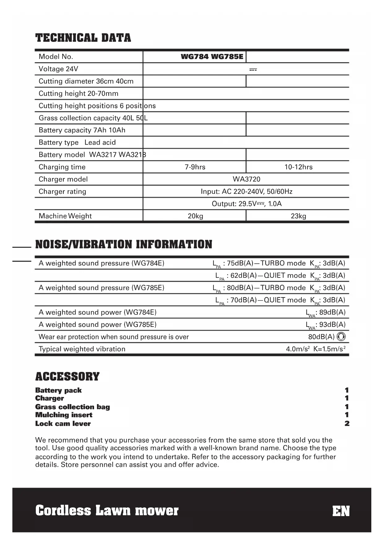 ACCESSORY Battery pack 1 Charger 1 Grass collection bag 1 Mulching insert 1 Lock cam lever 2 We recommend that you purchase your accessories from the same store that sold you the tool. Use good quality accessories marked with a well-known brand name. Choose the type according to the work you intend to undertake. Refer to the accessory packaging for further details. Store personnel can assist you and offer advice.98