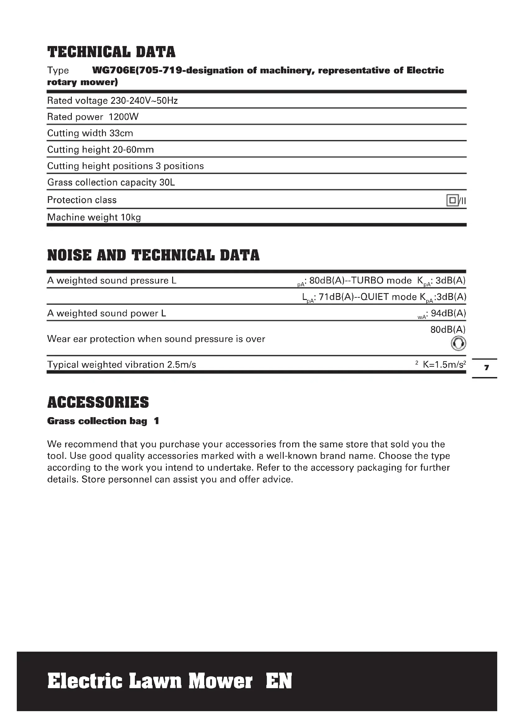 Electric Lawn Mower EN TECHNICAL DATA Type WG706E(705-719-designation of machinery, representative of Electric rotary mower) Rated voltage 230-240V~50Hz Rated power 1200W Cutting width 33cm Cutting height 20-60mm Cutting height positions 3 positions Grass collection capacity 30L Protection class /II Machine weight 10kg
