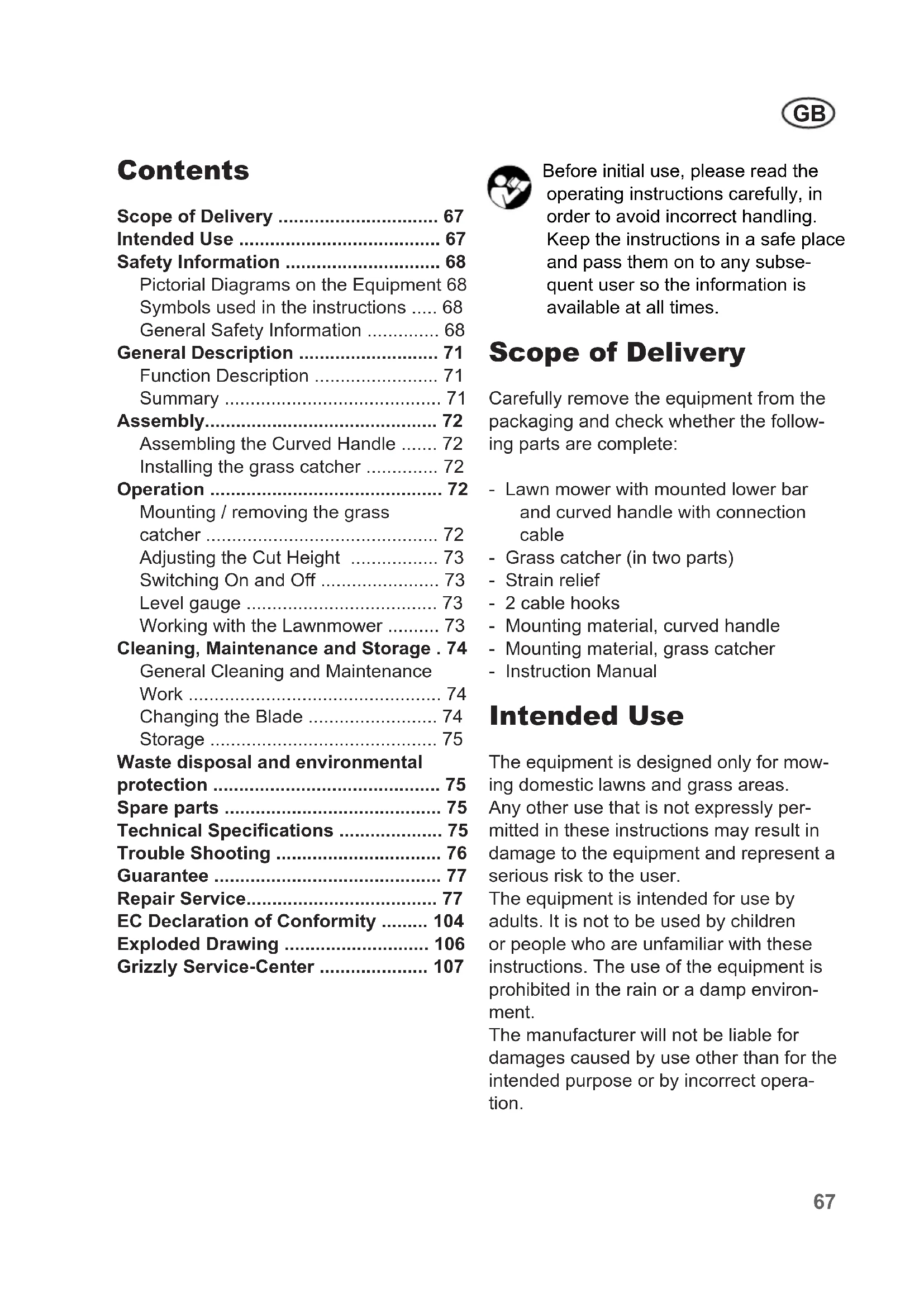 - Grizzly Service-Center Before initial use, please read the operating instructions carefully, in order to avoid incorrect handling. Keep the instructions in a safe place and pass them on to any subse- quent user so the information is available at all times. Scope of Delivery Carefully remove the equipment from the packaging and check whether the follow- ing parts are complete: - Lawn mower with mounted lower bar and curved handle with connection cable - Grass catcher (in two parts) - Strain relief - 2 cable hooks - Mounting material, curved handle - Mounting material, grass catcher - Instruction Manual Intended Use The equipment is designed only for mow- ing domestic lawns and grass areas. Any other use that is not expressly per- mitted in these instructions may result in damage to the equipment and represent a serious risk to the user. The equipment is intended for use by adults. It is not to be used by children or people who are unfamiliar with these instructions. The use of the equipment is prohibited in the rain or a damp environ- ment. The manufacturer will not be liable for damages caused by use other than for the intended purpose or by incorrect opera- tion.GB p. 107