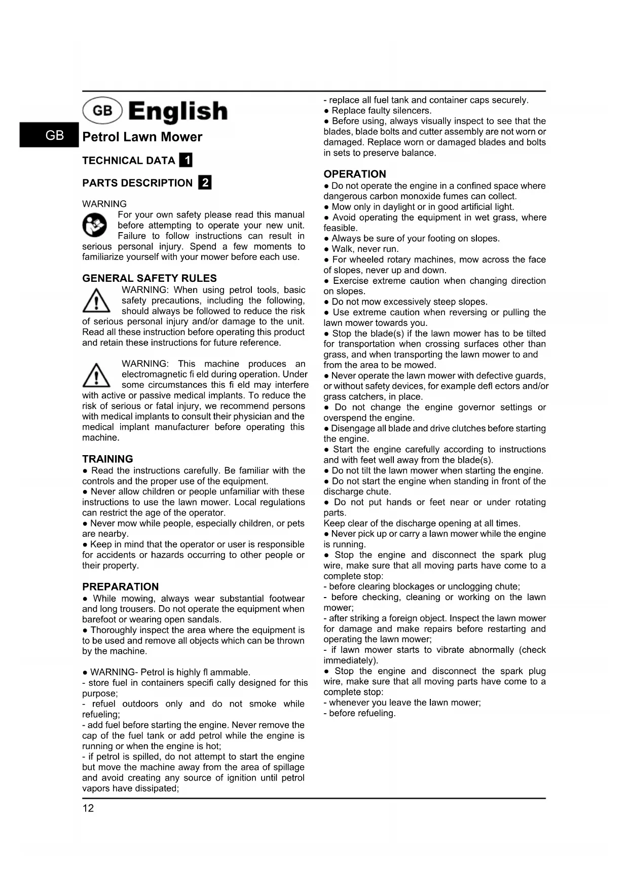 electromagnetic fi eld during operation. Under some circumstances this fi eld may interfere with active or passive medical implants. To reduce the risk of serious or fatal injury, we recommend persons with medical implants to consult their physician and the medical implant manufacturer before operating this machine. TRAINING ● Read the instructions carefully. Be familiar with the controls and the proper use of the equipment. ● Never allow children or people unfamiliar with these instructions to use the lawn mower. Local regulations can restrict the age of the operator. ● Never mow while people, especially children, or pets are nearby. ● Keep in mind that the operator or user is responsible for accidents or hazards occurring to other people or their property. PREPARATION ● While mowing, always wear substantial footwear and long trousers. Do not operate the equipment when barefoot or wearing open sandals. ● Thoroughly inspect the area where the equipment is to be used and remove all objects which can be thrown by the machine. ● WARNING- Petrol is highly fl ammable. - store fuel in containers specifi cally designed for this purpose; - refuel outdoors only and do not smoke while refueling; - add fuel before starting the engine. Never remove the cap of the fuel tank or add petrol while the engine is running or when the engine is hot; - if petrol is spilled, do not attempt to start the engine but move the machine away from the area of spillage and avoid creating any source of ignition until petrol vapors have dissipated; - replace all fuel tank and container caps securely. ● Replace faulty silencers. ● Before using, always visually inspect to see that the blades, blade bolts and cutter assembly are not worn or damaged. Replace worn or damaged blades and bolts in sets to preserve balance. OPERATION ● Do not operate the engine in a confi ned space where dangerous carbon monoxide fumes can collect. ● Mow only in daylight or in good artifi cial light. ● Avoid operating the equipment in wet grass, where feasible. ● Always be sure of your footing on slopes. ● Walk, never run. ● For wheeled rotary machines, mow across the face of slopes, never up and down. ● Exercise extreme caution when changing direction on slopes. ● Do not mow excessively steep slopes. ● Use extreme caution when reversing or pulling the lawn mower towards you. ● Stop the blade(s) if the lawn mower has to be tilted for transportation when crossing surfaces other than grass, and when transporting the lawn mower to and from the area to be mowed. ● Never operate the lawn mower with defective guards, or without safety devices, for example defl ectors and/or grass catchers, in place. ● Do not change the engine governor settings or overspend the engine. ● Disengage all blade and drive clutches before starting the engine. ● Start the engine carefully according to instructions and with feet well away from the blade(s). ● Do not tilt the lawn mower when starting the engine. ● Do not start the engine when standing in front of the discharge chute. ● Do not put hands or feet near or under rotating parts. Keep clear of the discharge opening at all times. ● Never pick up or carry a lawn mower while the engine is running. ● Stop the engine and disconnect the spark plug wire, make sure that all moving parts have come to a complete stop: - before clearing blockages or unclogging chute; - before checking, cleaning or working on the lawn mower; - after striking a foreign object. Inspect the lawn mower for damage and make repairs before restarting and operating the lawn mower; - if lawn mower starts to vibrate abnormally (check immediately). ● Stop the engine and disconnect the spark plug wire, make sure that all moving parts have come to a complete stop: - whenever you leave the lawn mower; - before refueling.13