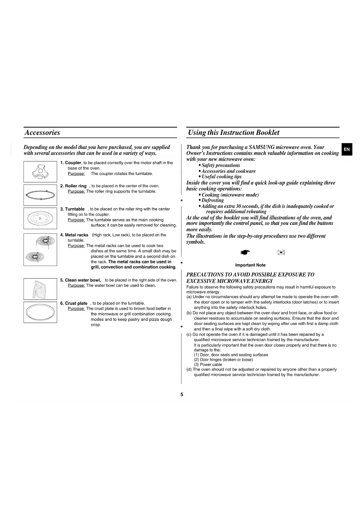Accessories Depending on the model that you have purchased, you are supplied with several accessories that can be used in a variety of ways. Using this Instruction Booklet Thank you for purchasing a SAMSUNG microwave oven. Your Owner’s Instructions contains much valuable information on cooking with your new microwave oven: