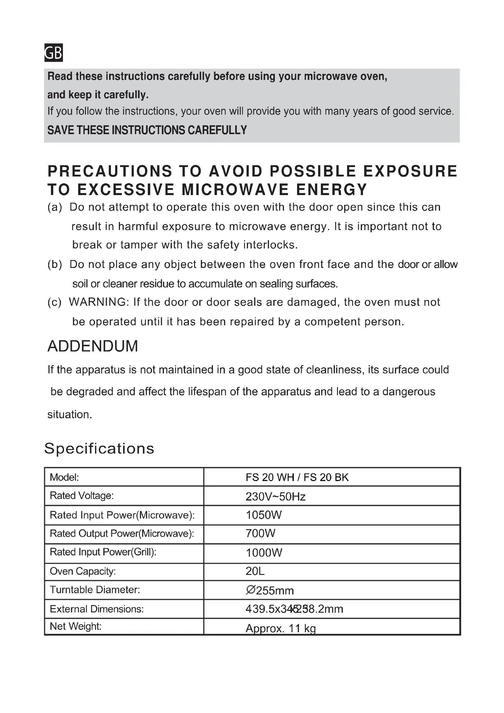 (a) Do not attempt to operate this oven with the door open since this canresult in harmful exposure to microwave energy. It is important not to break or tamper with the safety interlocks.(b) Do not place any object between the oven front face and the door or allow soil or cleaner residue to accumulate on sealing surfaces.(c) WARNING: If the door or door seals are damaged, the oven must not be operated until it has been repaired by a competent person.If the apparatus is not maintained in a good state of cleanliness, its surface could be degraded and affect the lifespan of the apparatus and lead to a dangeroussituation. ADDENDUM
