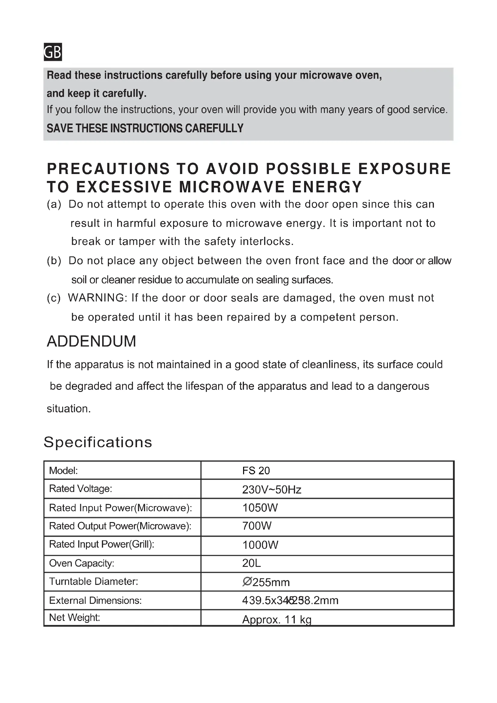 (a) Do not attempt to operate this oven with the door open since this canresult in harmful exposure to microwave energy. It is important not to break or tamper with the safety interlocks.(b) Do not place any object between the oven front face and the door or allow soil or cleaner residue to accumulate on sealing surfaces.(c) WARNING: If the door or door seals are damaged, the oven must not be operated until it has been repaired by a competent person.If the apparatus is not maintained in a good state of cleanliness, its surface could be degraded and affect the lifespan of the apparatus and lead to a dangeroussituation. ADDENDUM
