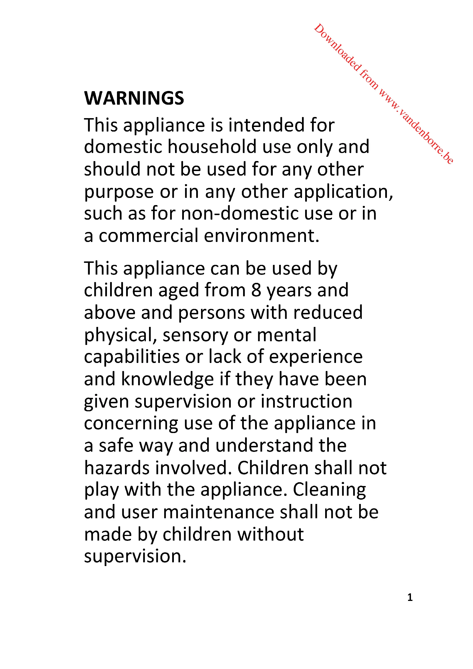 Downloaded from www.vandenborre.beWARNINGS This appliance is intended for domestic household use only and should not be used for any other purpose or in any other application, such as for non-domestic use or in a commercial environment. This appliance can be used by children aged from 8 years and above and persons with reduced physical, sensory or mental capabilities or lack of experience and knowledge if they have been given supervision or instruction concerning use of the appliance in a safe way and understand the hazards involved. Children shall not play with the appliance. Cleaning and user maintenance shall not be made by children without supervision.
