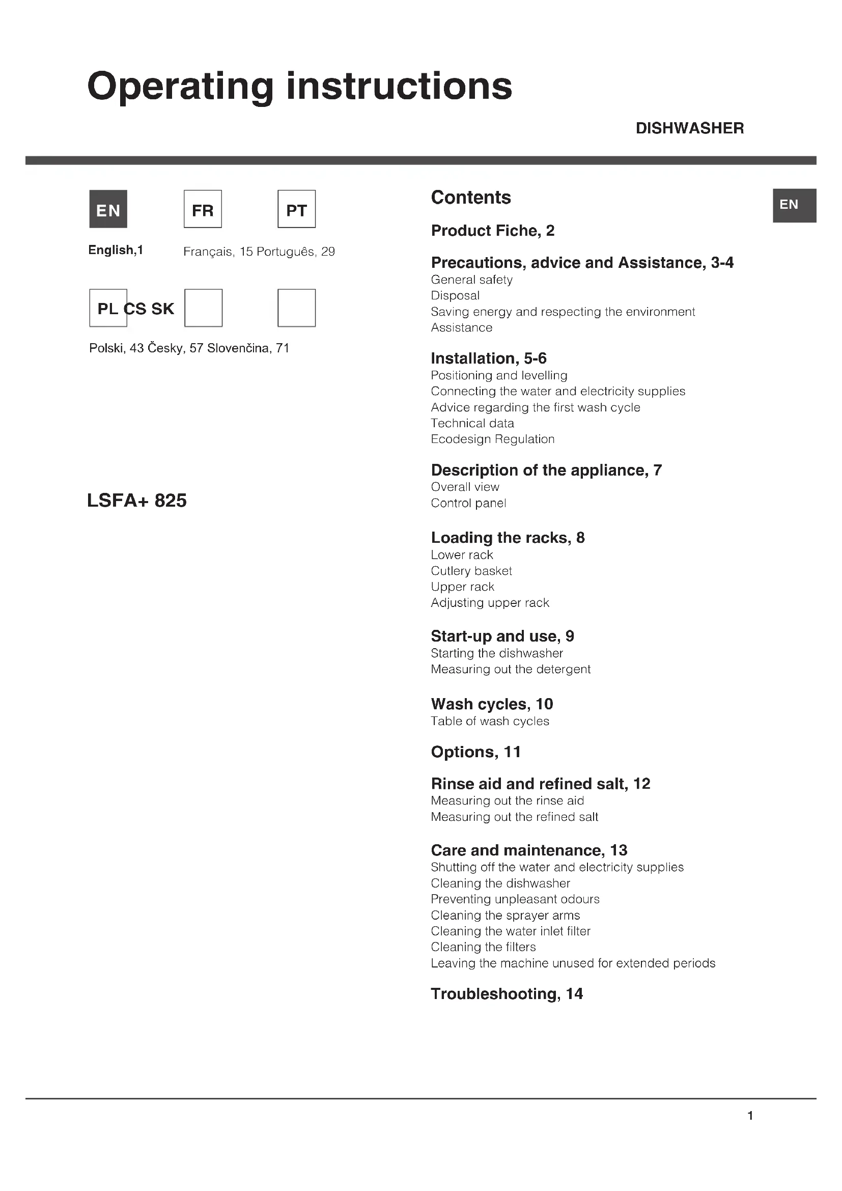 Operating instructions Contents Product Fiche, 2 Precautions, advice and Assistance, 3-4 General safety Disposal Saving energy and respecting the environment Assistance Installation, 5-6 Positioning and levelling Connecting the water and electricity supplies Advice regarding the first wash cycle Technical data Ecodesign Regulation Description of the appliance, 7 Overall view Control panel Loading the racks, 8 Lower rack Cutlery basket Upper rack Adjusting upper rack Start-up and use, 9 Starting the dishwasher Measuring out the detergent Wash cycles, 10 Table of wash cycles Options, 11 Rinse aid and refined salt, 12 Measuring out the rinse aid Measuring out the refined salt Care and maintenance, 13 Shutting off the water and electricity supplies Cleaning the dishwasher Preventing unpleasant odours Cleaning the sprayer arms Cleaning the water inlet filter Cleaning the filters Leaving the machine unused for extended periods Troubleshooting, 14 English,1