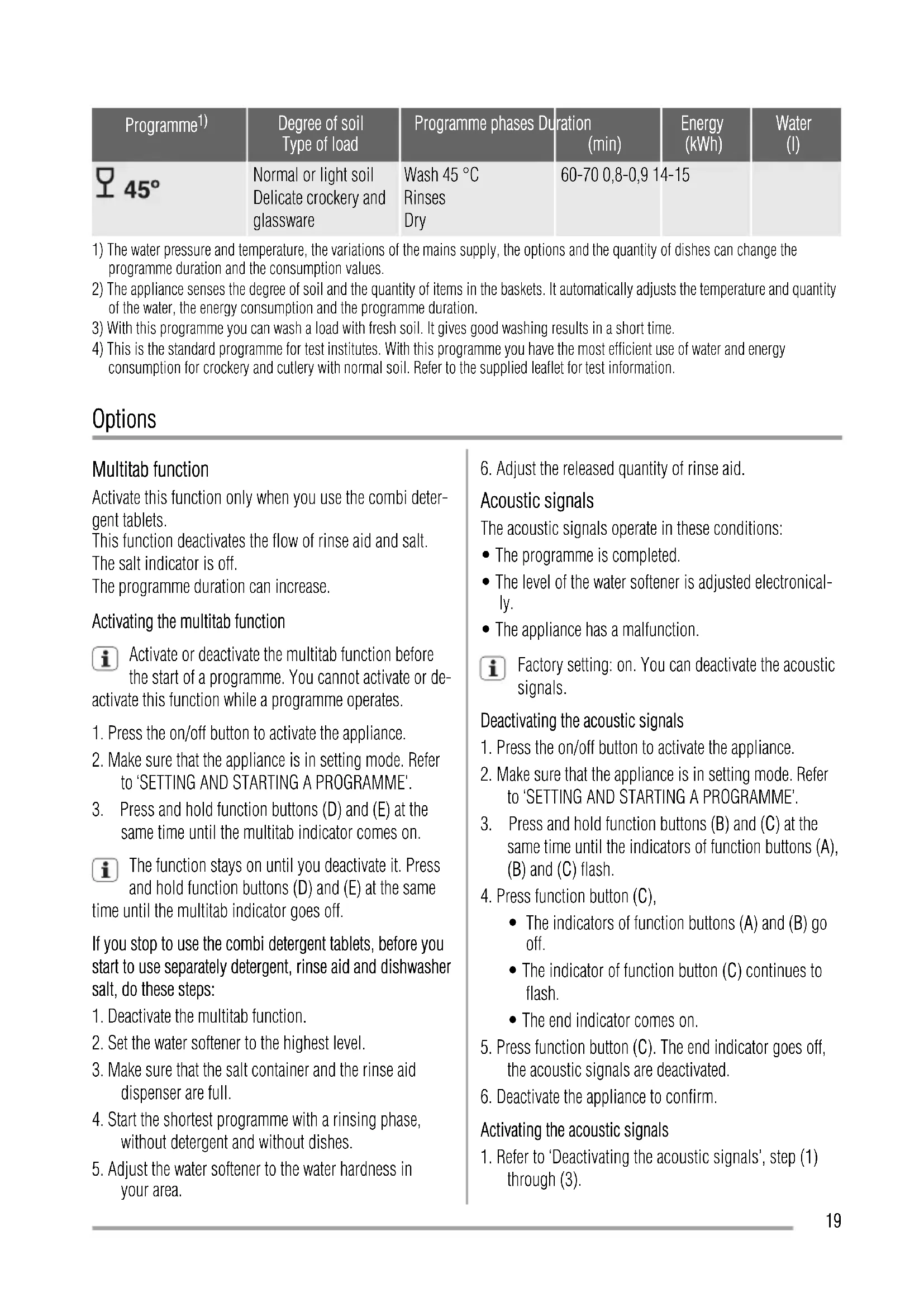 4) This is the standard programme for test institutes. With this programme you have the most efficient use of water and energy consumption for crockery and cutlery with normal soil. Refer to the supplied leaflet for test information. Options Multitab function Activate this function only when you use the combi deter- gent tablets. This function deactivates the flow of rinse aid and salt. The salt indicator is off. The programme duration can increase. Activating the multitab function Activate or deactivate the multitab function before the start of a programme. You cannot activate or de- activate this function while a programme operates.