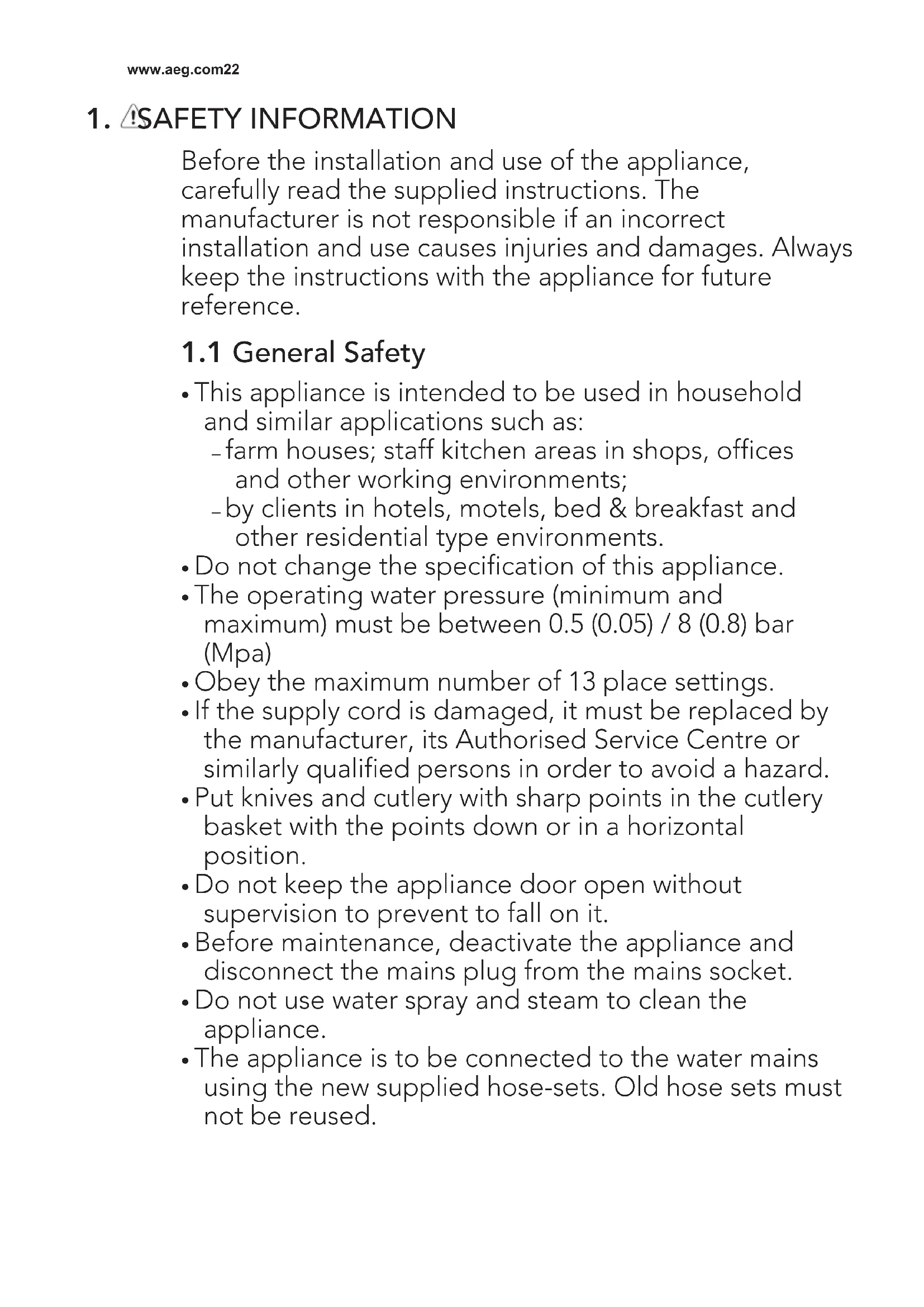 - The appliance is to be connected to the water mains using the new supplied hose-sets. Old hose sets must not be reused. www.aeg.com221.2 Children and vulnerable people safety