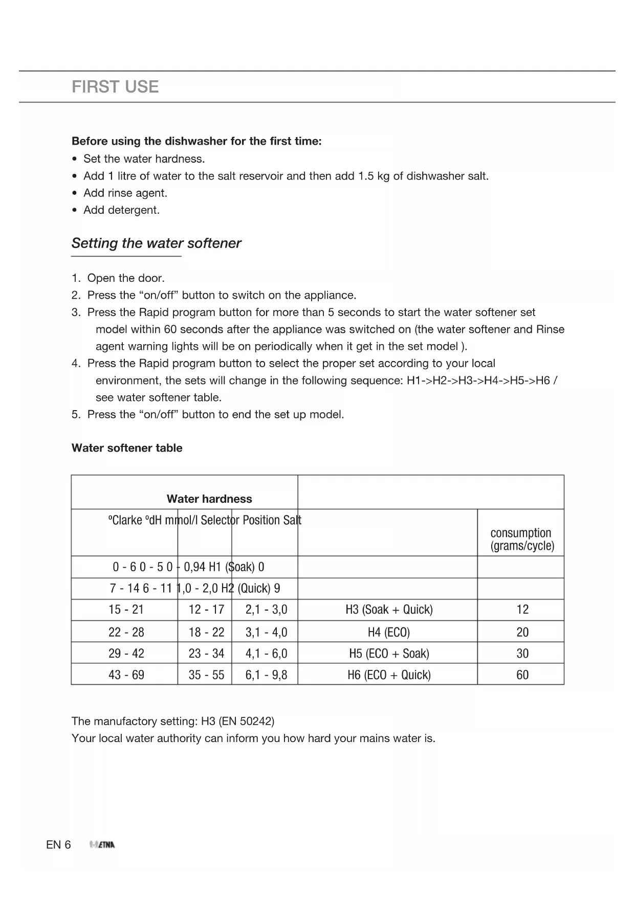 The manufactory setting: H3 (EN 50242) Your local water authority can inform you how hard your mains water is.EN 7 FIRST USE Adding salt This machine is equipped with a water softener. To use the water softener, fill the dishwasher with salt.