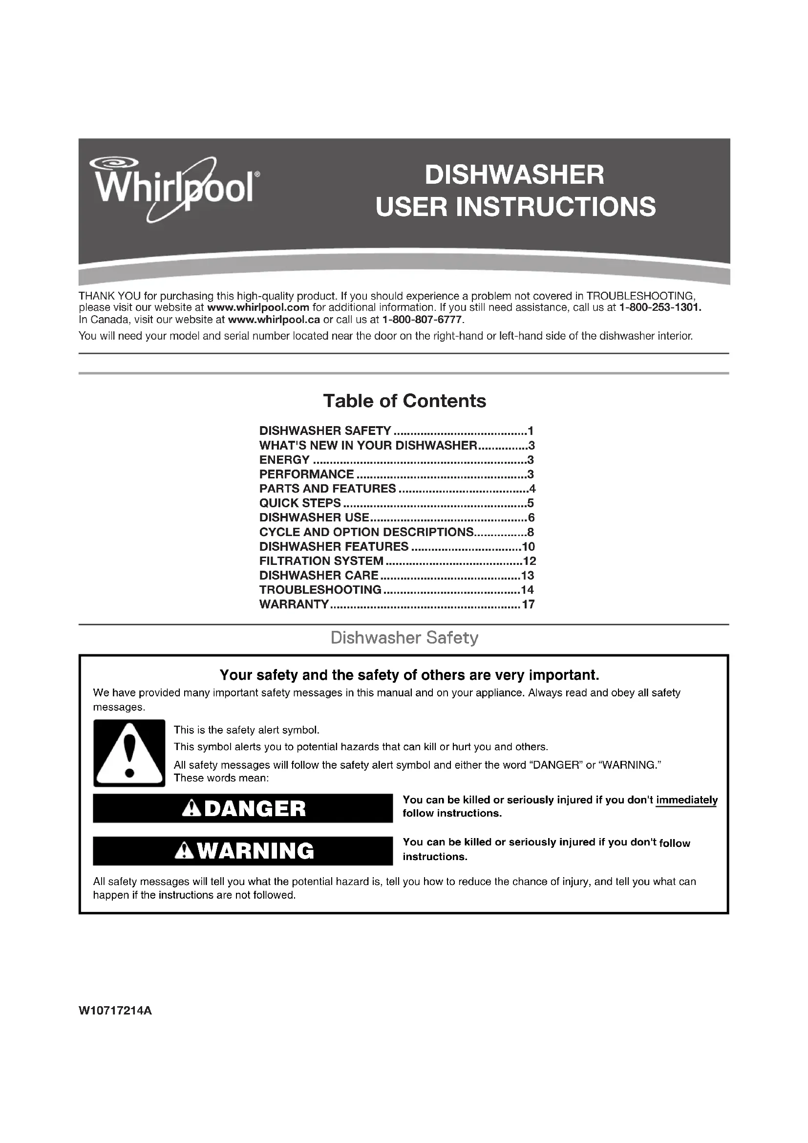 - W10717214A DISHWASHER USER INSTRUCTIONS THANK YOU for purchasing this high-quality product. If you should experience a problem not covered in TROUBLESHOOTING, please visit our website at www.whirlpool.com for additional information. If you still need assistance, call us at 1-800-253-1301. In Canada, visit our website at www.whirlpool.ca or call us at 1-800-807-6777. You will need your model and serial number located near the door on the right-hand or left-hand side of the dishwasher interior. Table of Contents DISHWASHER SAFETY p. 1