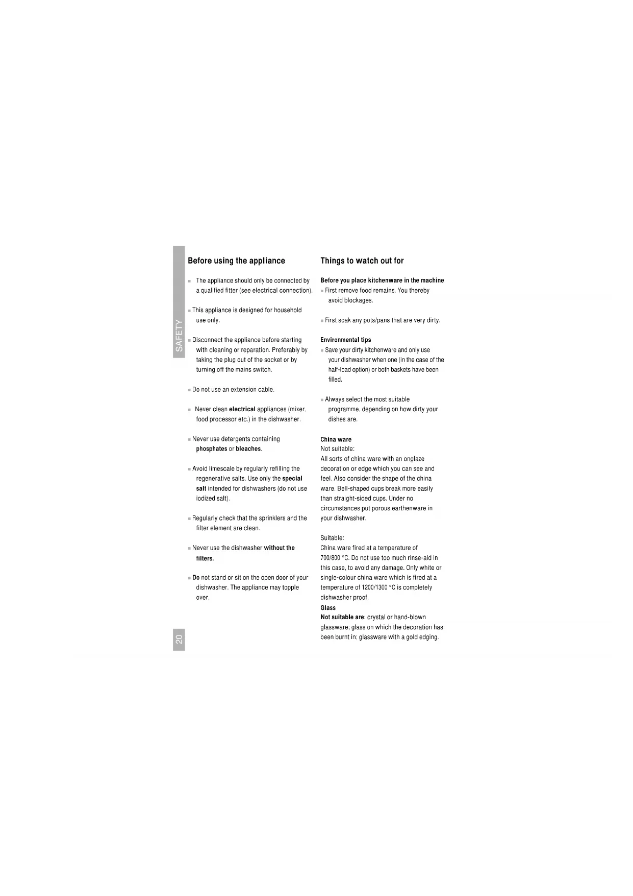 The appliance should only be connected by a qualified fitter (see electrical connection). ■ This appliance is designed for household use only. ■ Disconnect the appliance before starting with cleaning or reparation. Preferably by taking the plug out of the socket or by turning off the mains switch. ■ Do not use an extension cable. ■ Never clean electrical appliances (mixer, food processor etc.) in the dishwasher. ■ Never use detergents containing phosphates or bleaches. ■ Avoid limescale by regularly refilling the regenerative salts. Use only the special salt intended for dishwashers (do not use iodized salt). ■ Regularly check that the sprinklers and the filter element are clean. ■ Never use the dishwasher without the filters. ■ Do not stand or sit on the open door of your dishwasher. The appliance may topple over. Things to watch out for Before you place kitchenware in the machine ■ First remove food remains. You thereby avoid blockages. ■ First soak any pots/pans that are very dirty. Environmental tips ■ Save your dirty kitchenware and only use your dishwasher when one (in the case of the half-load option) or both baskets have been filled. ■ Always select the most suitable programme, depending on how dirty your dishes are. China ware Not suitable: All sorts of china ware with an onglaze decoration or edge which you can see and feel. Also consider the shape of the china ware. Bell-shaped cups break more easily than straight-sided cups. Under no circumstances put porous earthenware in your dishwasher. Suitable: China ware fired at a temperature of 700/800 °C. Do not use too much rinse-aid in this case, to avoid any damage. Only white or single-colour china ware which is fired at a temperature of 1200/1300 °C is completely dishwasher proof. Glass Not suitable are: crystal or hand-blown glassware; glass on which the decoration has been burnt in; glassware with a gold edging.Suitable: all other glass. Cutlery Not suitable: Cutlery with a wooden, earthenware or china- ware handle. There is a big risk of cracks. In fact, there is a big risk of cracks for all wooden objects washed in a dishwasher. Cutlery made of chromium steel is not very suitable for washing in the dishwasher. In the case of this cutlery, there is a risk of corrosion (rust). Suitable: Cutlery made of chromium nickel steel 18/10. This high-quality cutlery is rustproof and acid- resistant. However, the blade of a knife may be made of a different material. Watch out for this. Silver or silver-plated cutlery is also dishwasher proof. But in this case the rinse- aid used must not contain any citric acid, since this damages the silver. Moreover, regular washing in the dishwasher may result in the silver becoming scratched. Attention: You will get longer-lasting pleasure from your cutlery and dishwasher if you follow these tips: ■ After using the cutlery - especially knives - rinse it under the tap. You hereby prevent it being damaged by food remains containing salt and acid. ■ Always place knives, forks and spoons in the dishwasher with the handle downwards. ■ Do not put chromium nickel steel cutlery and chromium steel cutlery together in the dishwasher. Otherwise, you run the risk of rust contamination. ■ Take the cutlery out of the dishwasher immediately after the rinsing programme and dry it with a cloth. Never leave damp cutlery in the dishwasher. ■ Never put silver and stainless steel cutlery in one basket together. ■ Silver cutlery should never be allowed to come into contact with aluminium, since this can damage the silver. ■ Plastic pan handles can become dull. Furthermore... ■ Plastic objects must be heat-resistant. ■ Aluminium pans, kitchenware and various types of glassware may become discoloured after being washed several times in the dishwasher. Certain sorts of decoration may lose their colour. ■ Watch out for the indication "Suitable for the dishwasher" in the case of glazed pottery. ■ When you buy new tableware, look for forms which are suitable for the dishwasher: such as straight, smooth sides, large openings, cavities which are not too deep, dishwasher-proof decoration, cutlery and earthenware.