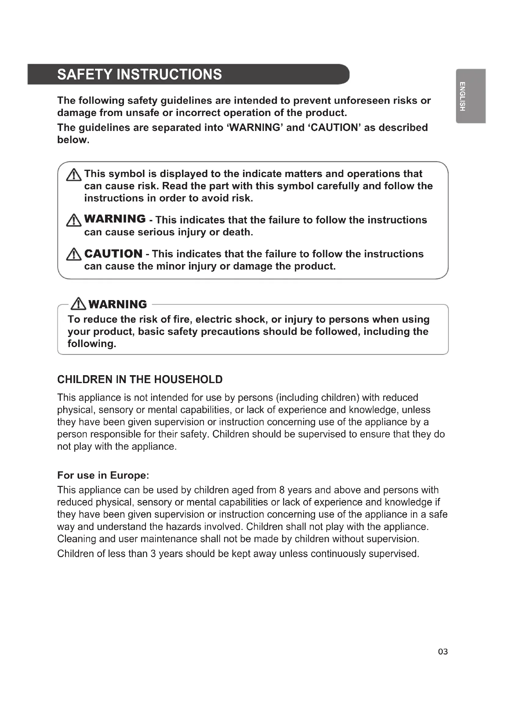 This appliance is not intended for use by persons (including children) with reduced physical, sensory or mental capabilities, or lack of experience and knowledge, unless they have been given supervision or instruction concerning use of the appliance by a person responsible for their safety. Children should be supervised to ensure that they do not play with the appliance. For use in Europe: This appliance can be used by children aged from 8 years and above and persons with reduced physical, sensory or mental capabilities or lack of experience and knowledge if they have been given supervision or instruction concerning use of the appliance in a safe way and understand the hazards involved. Children shall not play with the appliance. Cleaning and user maintenance shall not be made by children without supervision. Children of less than 3 years should be kept away unless continuously supervised.04 GROUNDING REQUIREMENTS For your safety, the information in this manual must be followed to minimize the risk of re, explosion, or electric shock, or to prevent property damage, injury to persons, or death. WARNING