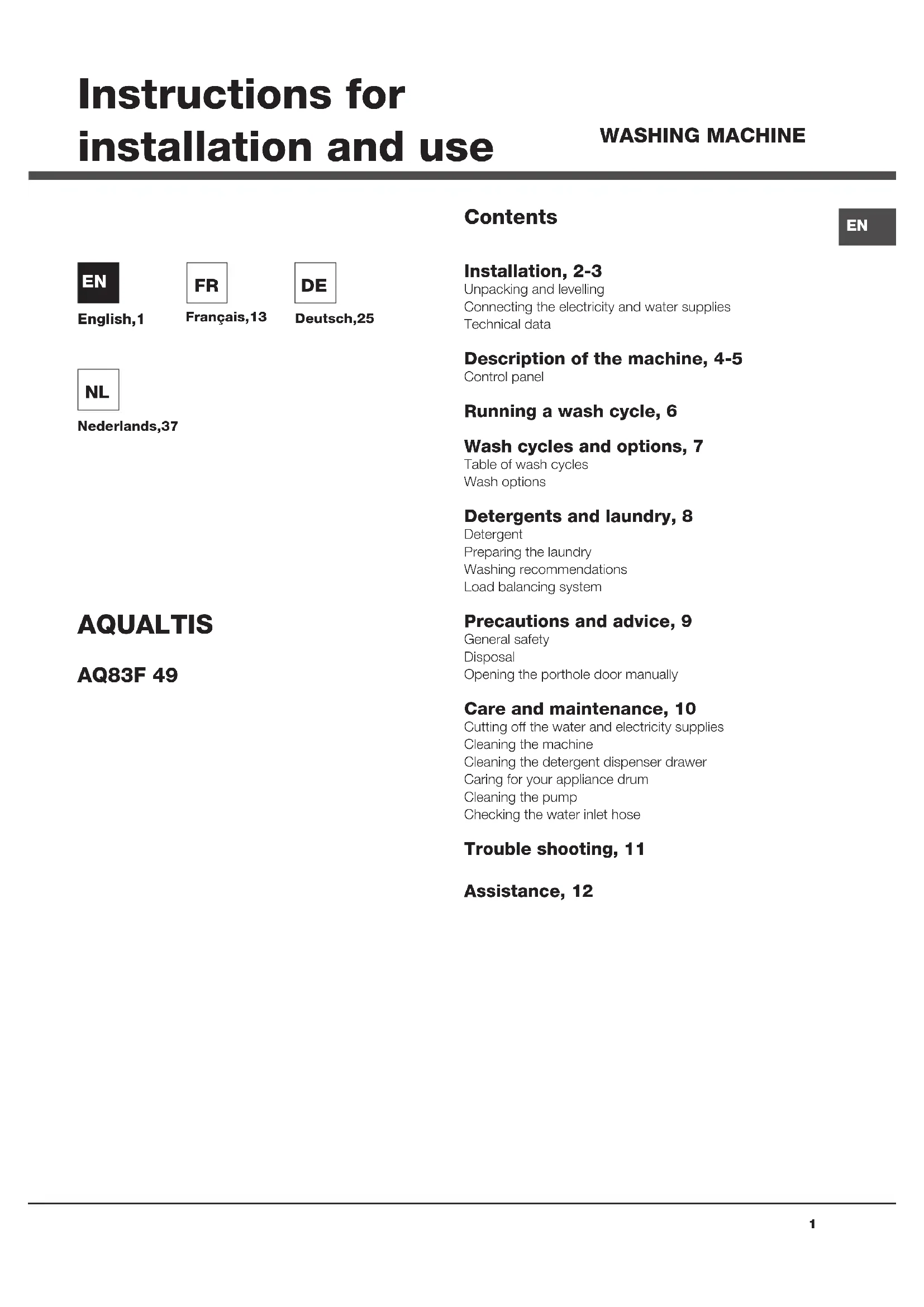 Aqualtis AQ83F 49 EU - Washing machine HOTPOINT ARISTON - Free user manual and instructions