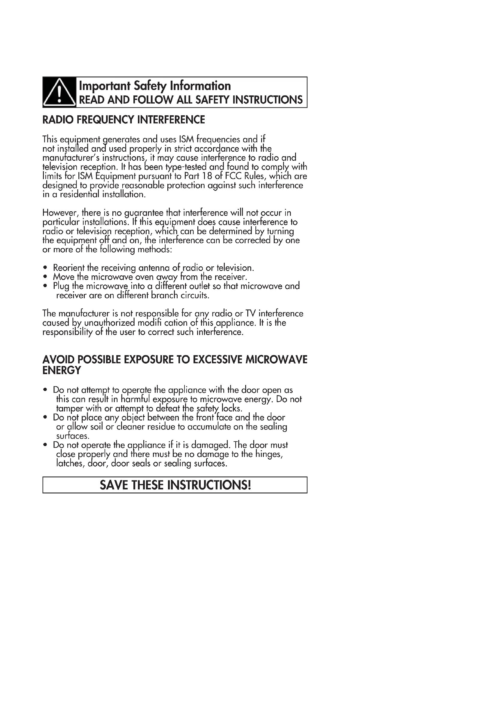 - Plug the microwave into a different outlet so that microwave and receiver are on different branch circuits. The manufacturer is not responsible for any radio or TV interference caused by unauthorized modifi cation of this appliance. It is the responsibility of the user to correct such interference.