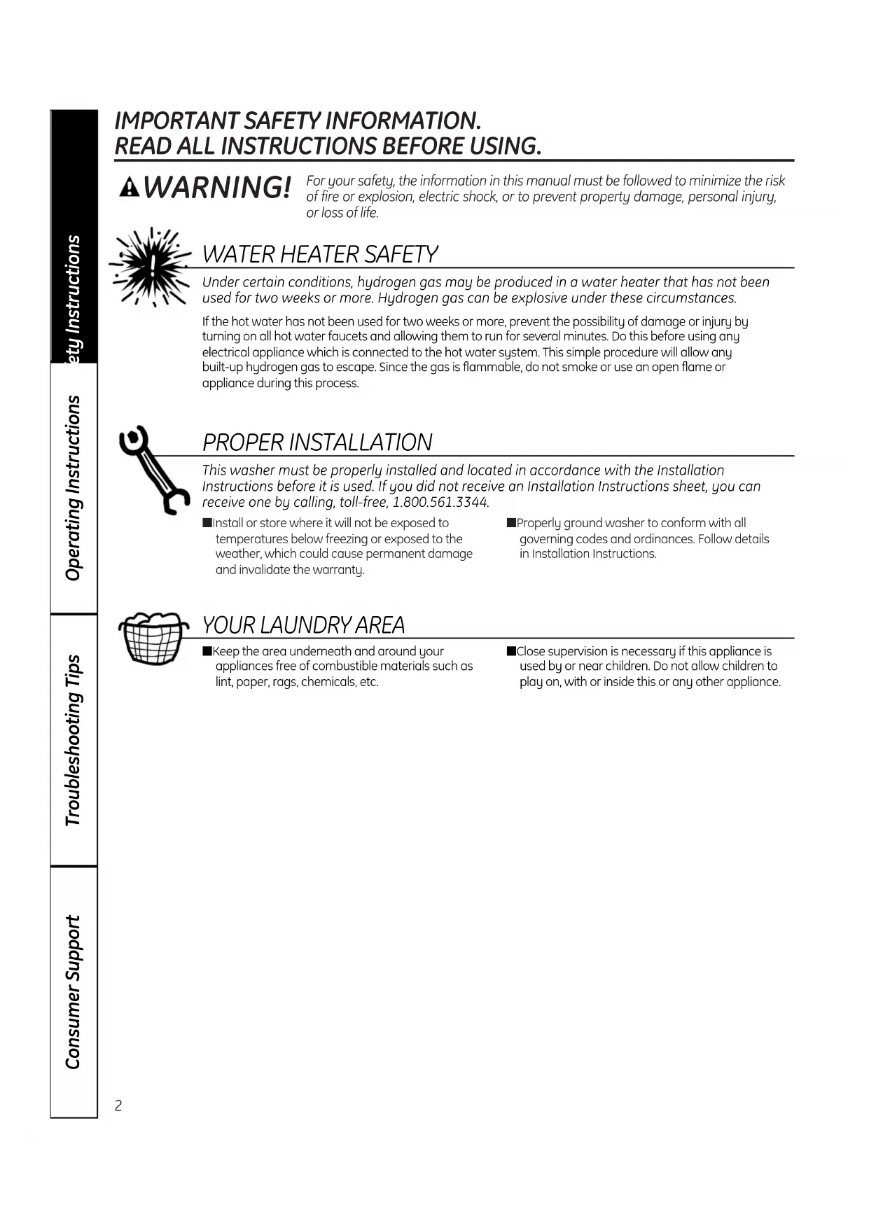 Under certain conditions, hydrogen gas may be produced in a water heater that has not been used for two weeks or more. Hydrogen gas can be explosive under these circumstances. If the hot water has not been used for two weeks or more, prevent the possibility of damage or injury byturning on all hot water faucets and allowing them to run for several minutes. Do this before using anyelectrical appliance which is connected to the hot water system. This simple procedure will allow any built-up hydrogen gas to escape. Since the gas is flammable, do not smoke or use an open flame or appliance during this process. PROPER INSTALLATION This washer must be properly installed and located in accordance with the Installation Instructions before it is used. If you did not receive an Installation Instructions sheet, you can receive one by calling, toll-free, 1.800.561.3344.