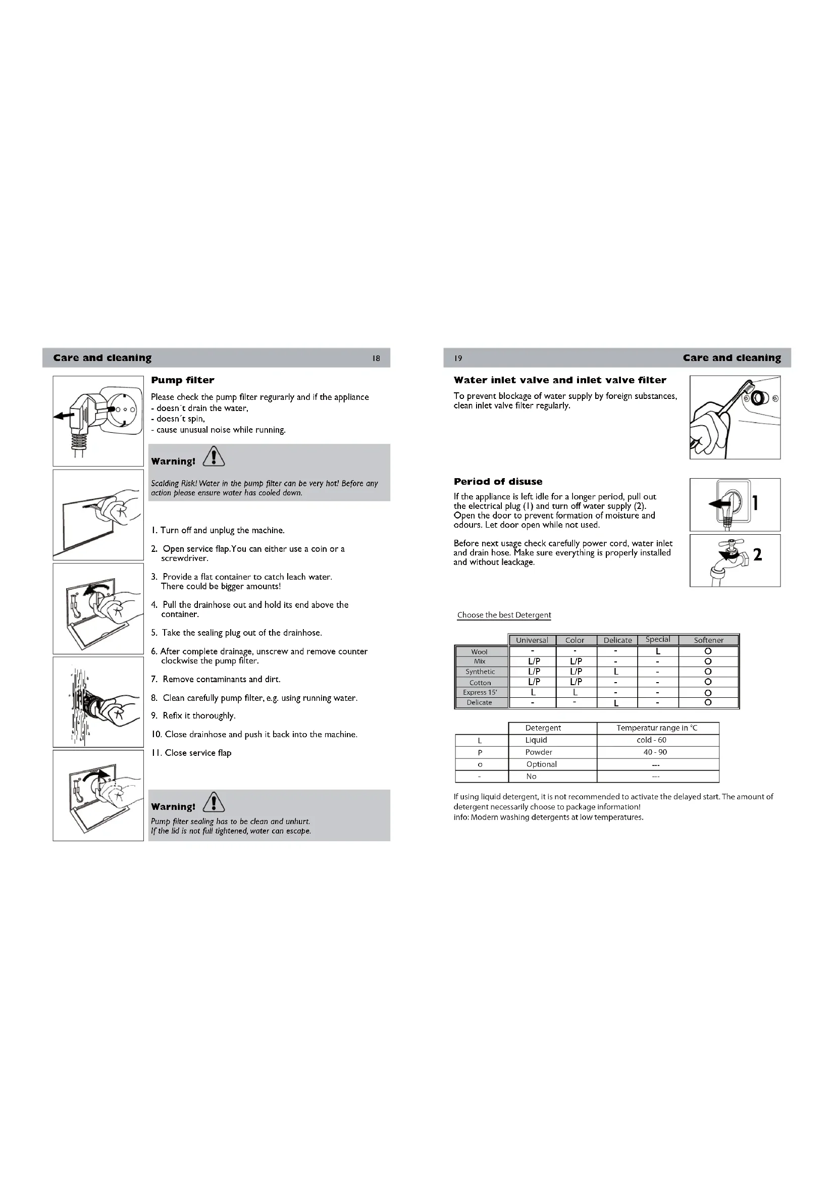 Care and cleaning Pump filter Please check the pump filter regurarly and if the appliance - doesn´t drain the water, - doesn´t spin, - cause unusual noise while running. Warning! Scalding Risk! Water in the pump filter can be very hot! Before any action please ensure water has cooled down.