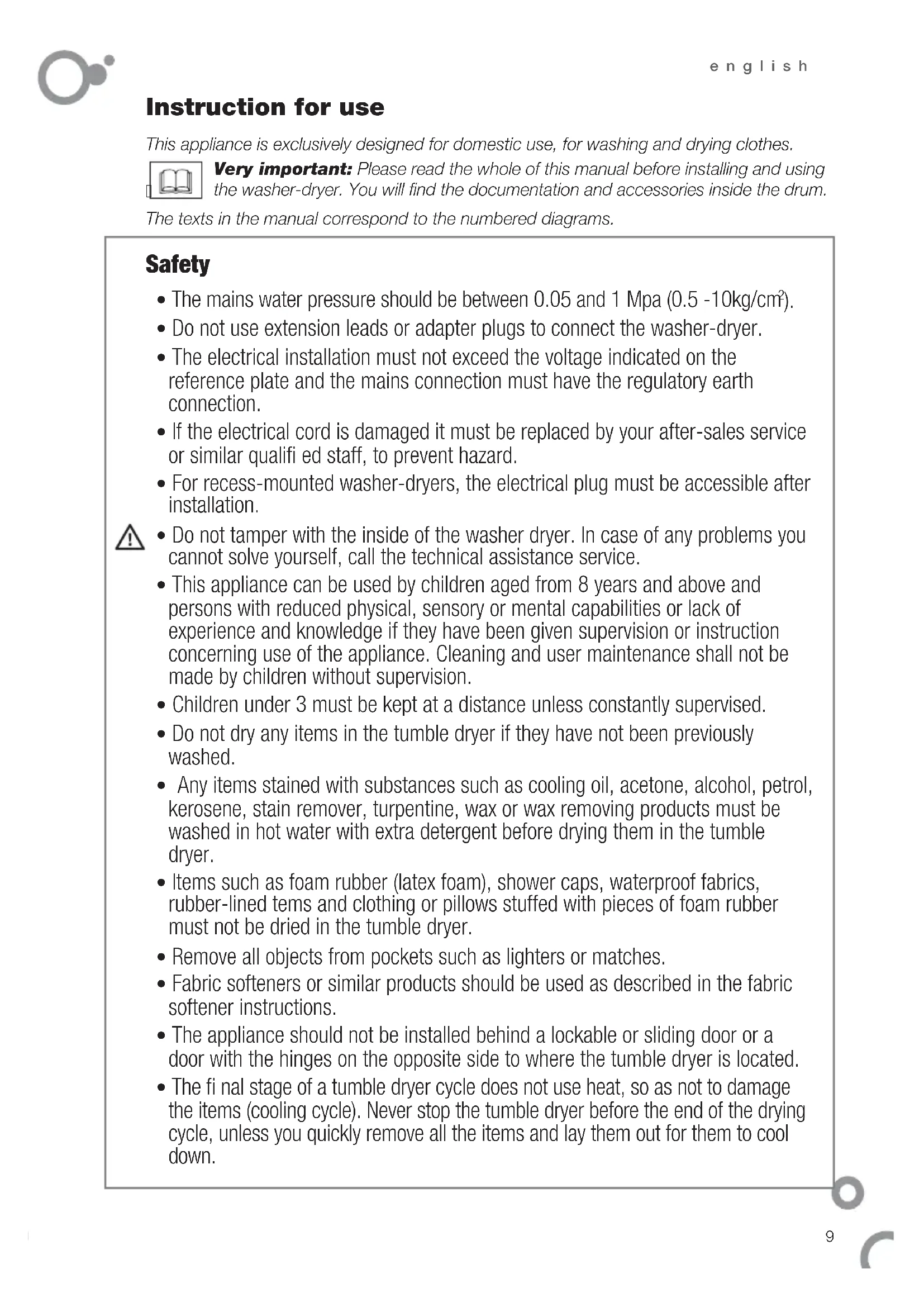 Instruction for use This appliance is exclusively designed for domestic use, for washing and drying clothes. Very important: Please read the whole of this manual before installing and using