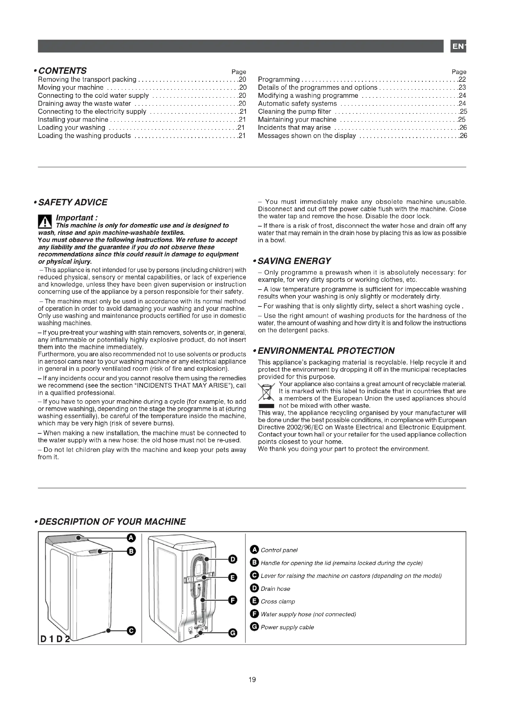 - ENVIRONMENTAL PROTECTION This appliance’s packaging material is recyclable. Help recycle it andprotect the environment by dropping it off in the municipal receptaclesprovided for this purpose. Your appliance also contains a great amount of recyclable material.It is marked with this label to indicate that in countries that area members of the European Union the used appliances shouldnot be mixed with other waste.This way, the appliance recycling organised by your manufacturer willbe done under the best possible conditions, in compliance with EuropeanDirective 2002/96/EC on Waste Electrical and Electronic Equipment.Contact your town hall or your retailer for the used appliance collectionpoints closest to your home.We thank you doing your part to protect the environment.20