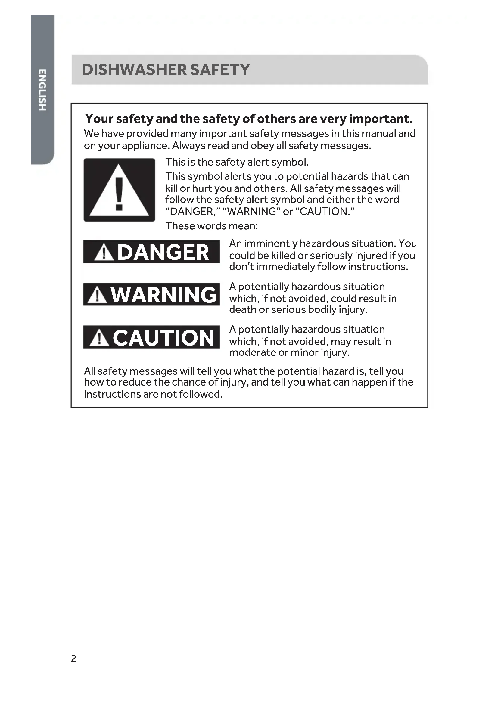 Date of purchase2 DISHWASHER SAFETY Your safety and the safety of others are very important. We have provided many important safety messages in this manual and on your appliance. Always read and obey all safety messages. DANGER WARNING CAUTION This is the safety alert symbol. This symbol alerts you to potential hazards that can kill or hurt you and others. All safety messages will follow the safety alert symbol and either the word “DANGER,” “WARNING” or “CAUTION.” These words mean: An imminently hazardous situation. You could be killed or seriously injured if you don’t immediately follow instructions. A potentially hazardous situation which, if not avoided, could result in death or serious bodily injury. A potentially hazardous situation which, if not avoided, may result in moderate or minor injury. All safety messages will tell you what the potential hazard is, tell you how to reduce the chance of injury, and tell you what can happen if the instructions are not followed.3 IMPORTANT SAFETY INSTRUCTIONS