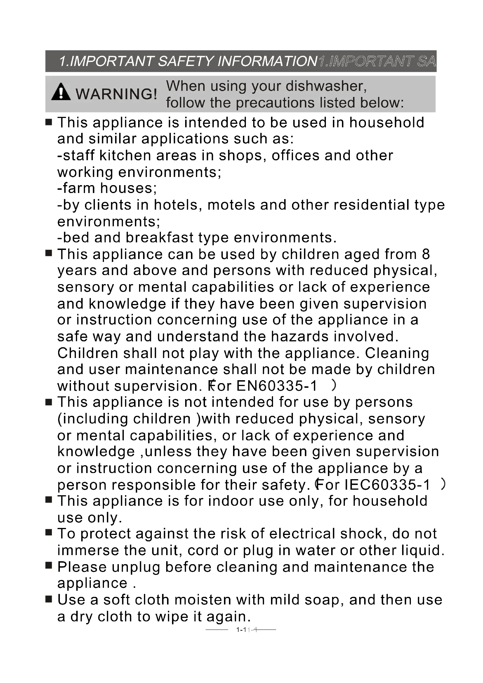 - The Method Loading Normal Dishware -11-1 This appliance is intended to be used in household and similar applications such as: -staff kitchen areas in shops, offices and other working environments; -farm houses; -by clients in hotels, motels and other residential type environments; -bed and breakfast type environments. This appliance can be used by children aged from 8 years and above and persons with reduced physical, sensory or mental capabilities or lack of experience and knowledge if they have been given supervision or instruction concerning use of the appliance in a safe way and understand the hazards involved. Children shall not play with the appliance. Cleaning and user maintenance shall not be made by children without supervision. For EN60335-1 This appliance is not intended for use by persons (including children )with reduced physical, sensory or mental capabilities, or lack of experience and knowledge ,unless they have been given supervision or instruction concerning use of the appliance by a person responsible for their safety. For IEC60335-1 This appliance is for indoor use only, for household use only. To protect against the risk of electrical shock, do not immerse the unit, cord or plug in water or other liquid. Please unplug before cleaning and maintenance the appliance . Use a soft cloth moisten with mild soap, and then use a dry cloth to wipe it again. p. 101
