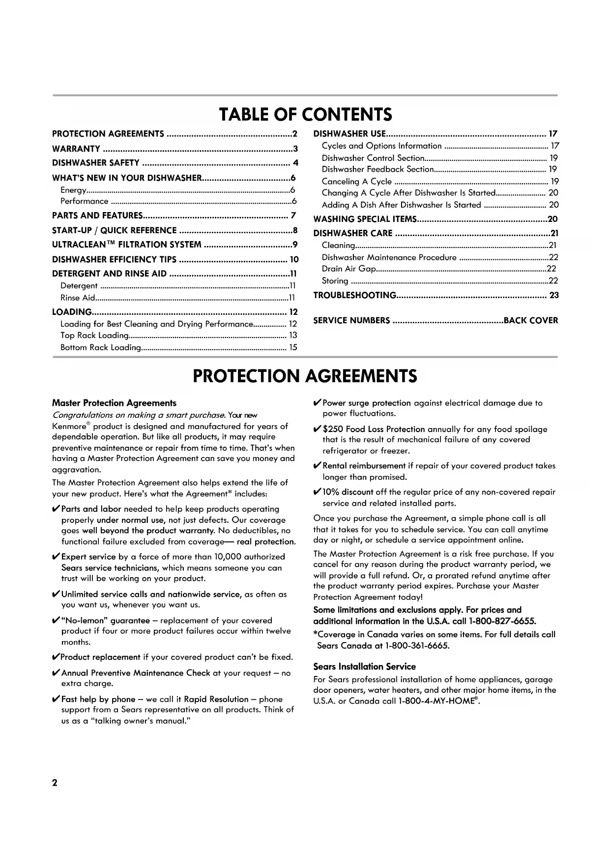 product is designed and manufactured for years of dependable operation. But like all products, it may require preventive maintenance or repair from time to time. That’s when having a Master Protection Agreement can save you money and aggravation. The Master Protection Agreement also helps extend the life of your new product. Here’s what the Agreement* includes: ✔Parts and labor needed to help keep products operating properly under normal use, not just defects. Our coverage goes well beyond the product warranty. No deductibles, no functional failure excluded from coverage— real protection. ✔Expert service by a force of more than 10,000 authorized Sears service technicians, which means someone you can trust will be working on your product. ✔Unlimited service calls and nationwide service, as often as you want us, whenever you want us. ✔“No-lemon” guarantee – replacement of your covered product if four or more product failures occur within twelve months. ✔Product replacement if your covered product can’t be fixed. ✔Annual Preventive Maintenance Check at your request – no extra charge. ✔Fast help by phone – we call it Rapid Resolution – phone support from a Sears representative on all products. Think of us as a “talking owner’s manual.” ✔Power surge protection against electrical damage due to power fluctuations. ✔$250 Food Loss Protection annually for any food spoilage that is the result of mechanical failure of any covered refrigerator or freezer. ✔Rental reimbursement if repair of your covered product takes longer than promised. ✔10% discount off the regular price of any non-covered repair service and related installed parts. Once you purchase the Agreement, a simple phone call is all that it takes for you to schedule service. You can call anytime day or night, or schedule a service appointment online. The Master Protection Agreement is a risk free purchase. If you cancel for any reason during the product warranty period, we will provide a full refund. Or, a prorated refund anytime after the product warranty period expires. Purchase your Master Protection Agreement today! Some limitations and exclusions apply. For prices and additional information in the U.S.A. call 18008276655. *Coverage in Canada varies on some items. For full details call Sears Canada at 18003616665. Sears Installation Service For Sears professional installation of home appliances, garage door openers, water heaters, and other major home items, in the U.S.A. or Canada call 18004MYHOME