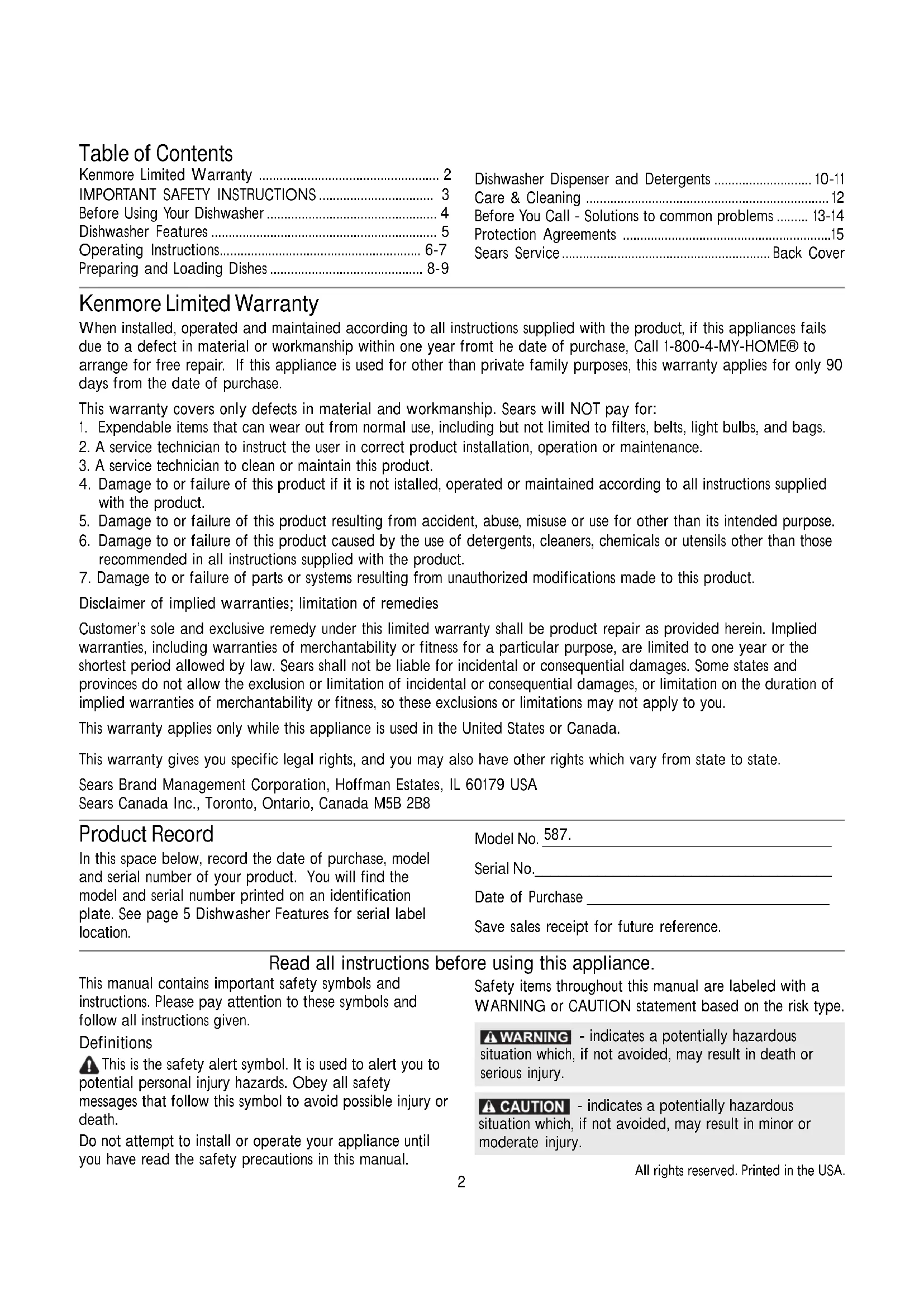 Safety items throughout this manual are labeled with a WARNING or CAUTION statement based on the risk type. This is the safety alert symbol. It is used to alert you to potential personal injury hazards. Obey all safety messages that follow this symbol to avoid possible injury or death. Definitions All rights reserved. Printed in the USA. Kenmore Limited Warranty .................................................... 2