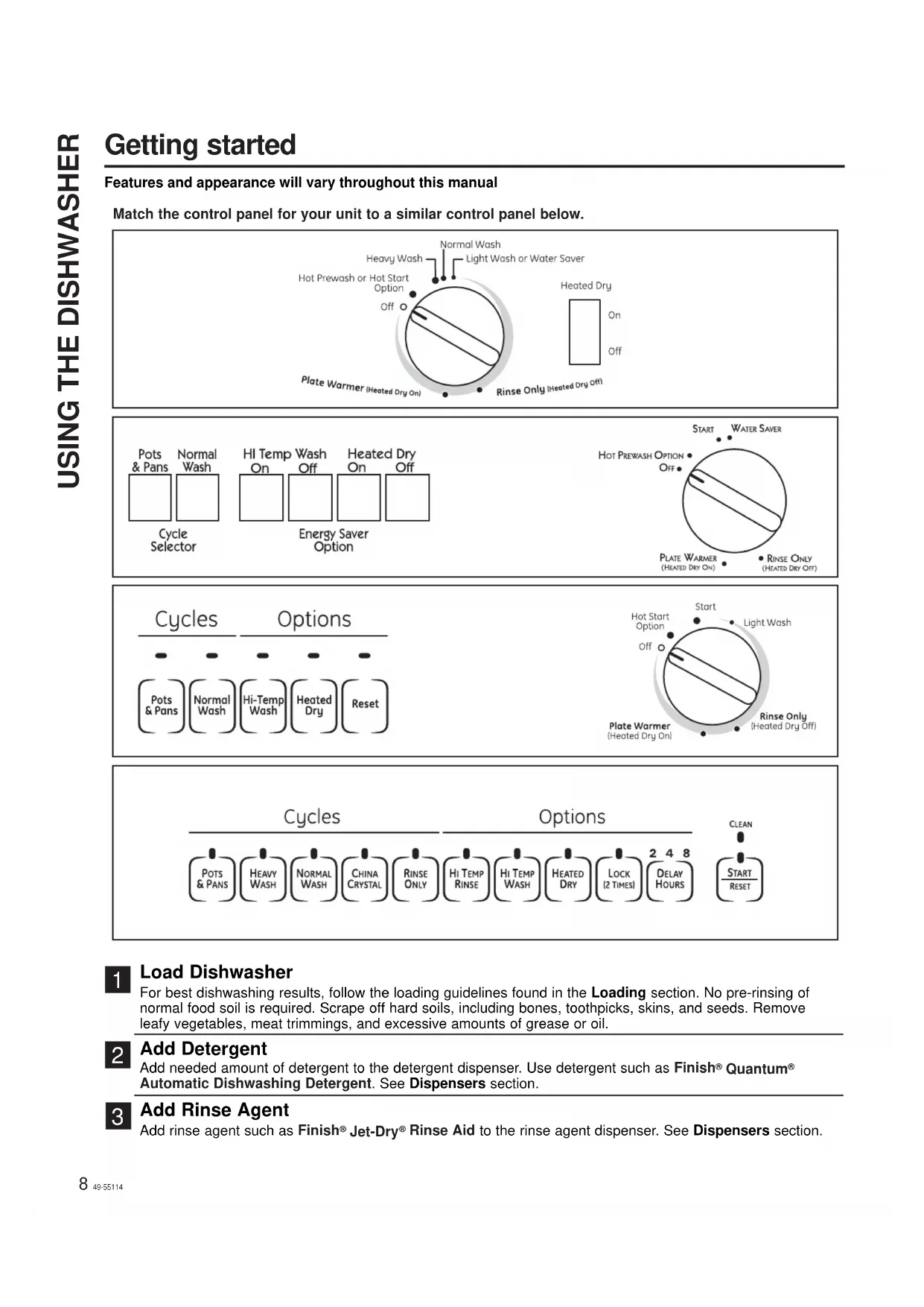 Features and appearance will vary throughout this manual Load Dishwasher For best dishwashing results, follow the loading guidelines found in the Loading section. No pre-rinsing of normal food soil is required. Scrape off hard soils, including bones, toothpicks, skins, and seeds. Remove leafy vegetables, meat trimmings, and excessive amounts of grease or oil. Add Detergent Add needed amount of detergent to the detergent dispenser. Use detergent such as Finish