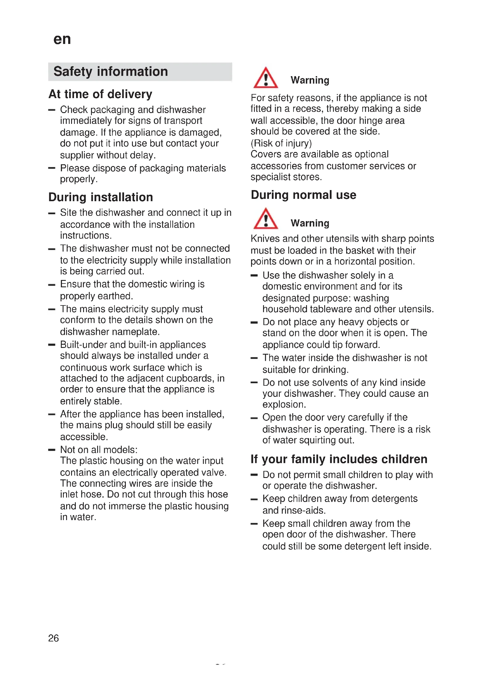 Safety information At time of delivery Check packaging and dishwasher immediately for signs of transport damage. If the appliance is damaged, do not put it into use but contact your supplier without delay. Please dispose of packaging materials properly. During installation Site the dishwasher and connect it up in accordance with the installation instructions. The dishwasher must not be connected to the electricity supply while installation is being carried out. Ensure that the domestic wiring is properly earthed. The mains electricity supply must conform to the details shown on the dishwasher nameplate. Built-under and built-in appliances should always be installed under a continuous work surface which is attached to the adjacent cupboards, in order to ensure that the appliance is entirely stable. After the appliance has been installed, the mains plug should still be easily accessible. Not on all models: The plastic housing on the water input contains an electrically operated valve. The connecting wires are inside the inlet hose. Do not cut through this hose and do not immerse the plastic housing in water. Warning For safety reasons, if the appliance is not fitted in a recess, thereby making a side wall accessible, the door hinge area should be covered at the side. (Risk of injury) Covers are available as optional accessories from customer services or specialist stores. During normal use Warning Knives and other utensils with sharp points must be loaded in the basket with their points down or in a horizontal position. Use the dishwasher solely in a domestic environment and for its designated purpose: washing household tableware and other utensils. Do not place any heavy objects or stand on the door when it is open. The appliance could tip forward. The water inside the dishwasher is not suitable for drinking. Do not use solvents of any kind inside your dishwasher. They could cause an explosion. Open the door very carefully if the dishwasher is operating. There is a risk of water squirting out. If your family includes children Do not permit small children to play with or operate the dishwasher. Keep children away from detergents and rinse-aids. Keep small children away from the open door of the dishwasher. There could still be some detergent left inside.en