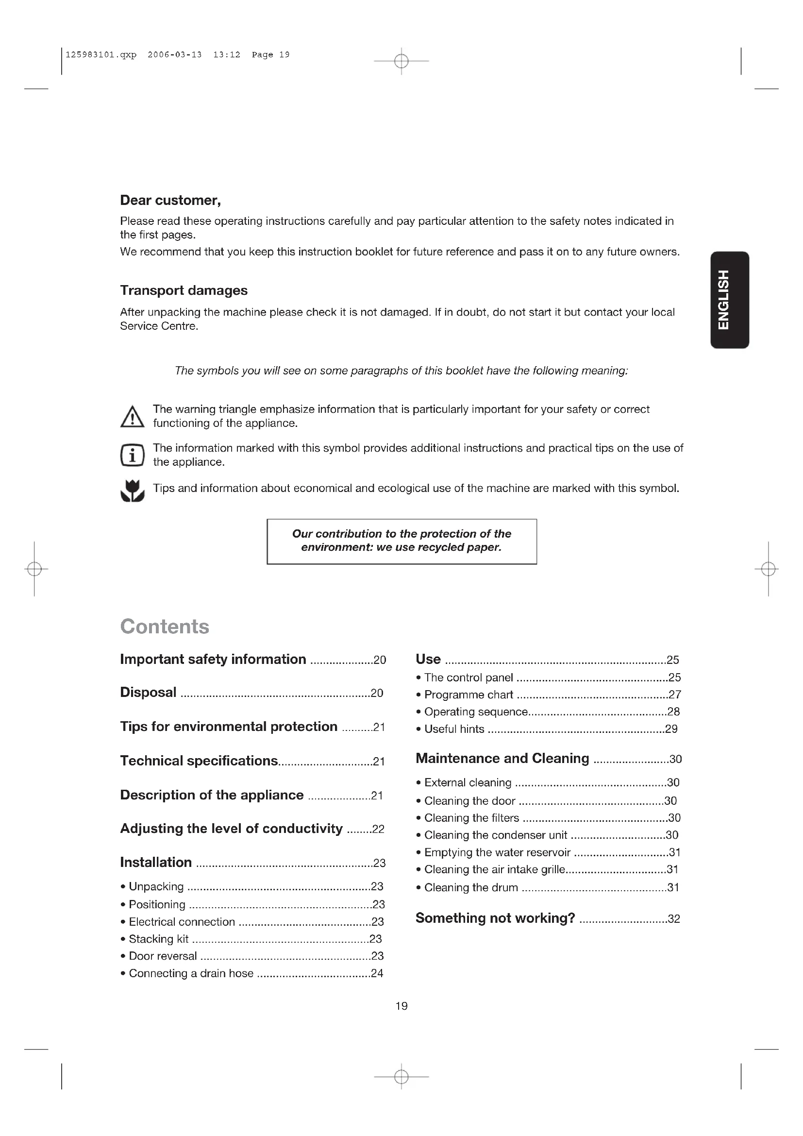- Cleaning the drum ..............................................31 Something not working? ............................32 Dear customer, Please read these operating instructions carefully and pay particular attention to the safety notes indicated in the first pages. We recommend that you keep this instruction booklet for future reference and pass it on to any future owners. Transport damages After unpacking the machine please check it is not damaged. If in doubt, do not start it but contact your local Service Centre. The symbols you will see on some paragraphs of this booklet have the following meaning: The warning triangle emphasize information that is particularly important for your safety or correct functioning of the appliance. The information marked with this symbol provides additional instructions and practical tips on the use of the appliance. Tips and information about economical and ecological use of the machine are marked with this symbol. Our contribution to the protection of the environment: we use recycled paper. 125983101.qxp 2006-03-13 13:12 Page 1920 Important safety information Installation