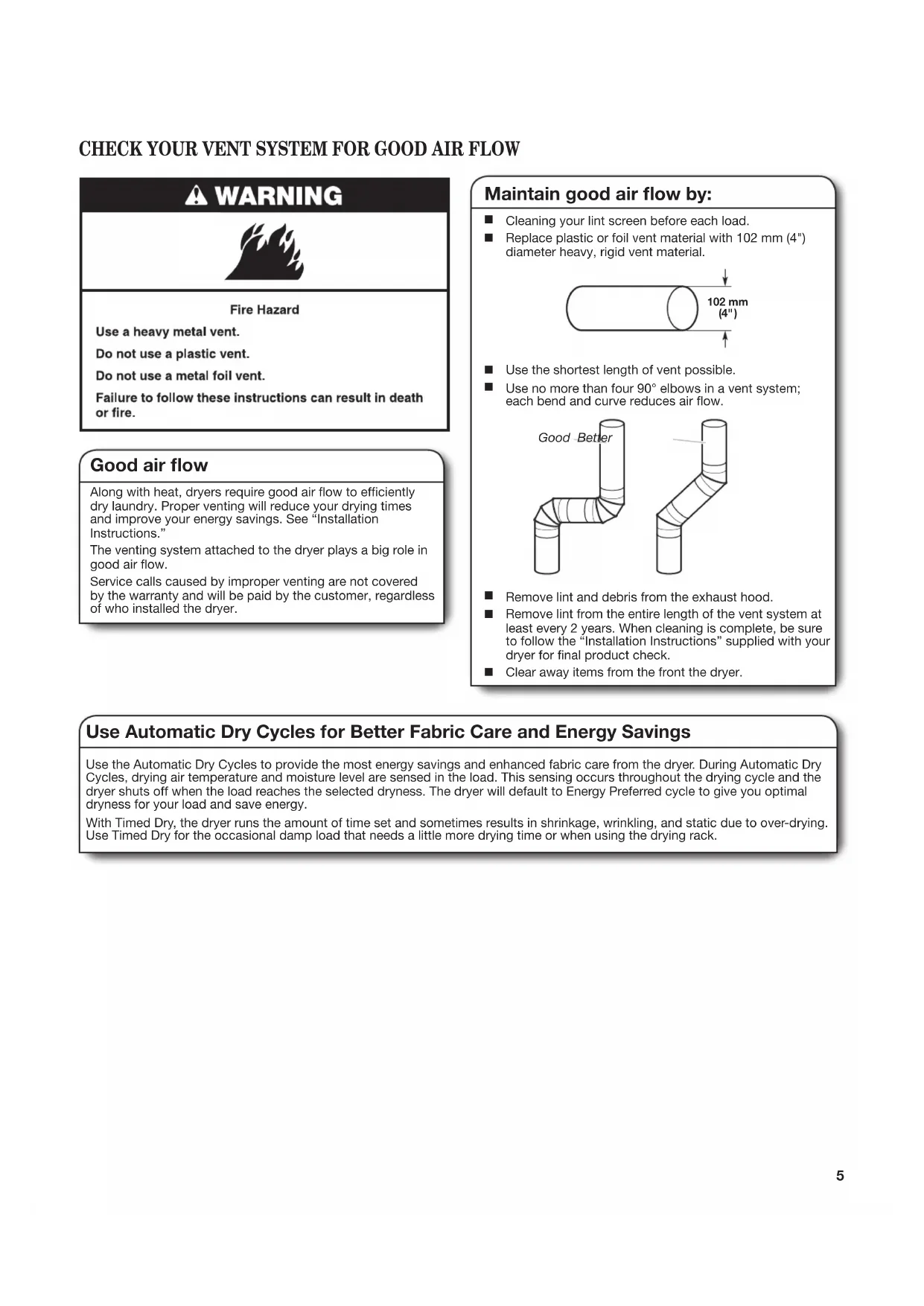 end of the drying cycle unless all items are quickly removed and spread out so that the heat is dissipated. To reduce the risk of re, electric shock, or injury to persons when using the dryer, follow basic The nal part of a tumble dryer cycle occurs without heat (cool down cycle) to ensure that the items are left at a temperature that ensures the items will not be damaged. If the supply cord is damaged, it must be replaced by the manufacturer or its service agent or a similarly qualied person in order to avoid a hazard. Remove all objects from pockets, including, but not limited to, lighters and matches. Do not exceed the maximum mass of dry textile material to be used in the appliance as listed under Specications.4 DRYER DISPOSAL5 CHECK YOUR VENT SYSTEM FOR GOOD AIR FLOW Good air ow Along with heat, dryers require good air ow to efciently dry laundry. Proper venting will reduce your drying times and improve your energy savings. See “Installation Instructions.” The venting system attached to the dryer plays a big role in good air ow. Service calls caused by improper venting are not covered by the warranty and will be paid by the customer, regardless of who installed the dryer. Maintain good air ow by: Good Better