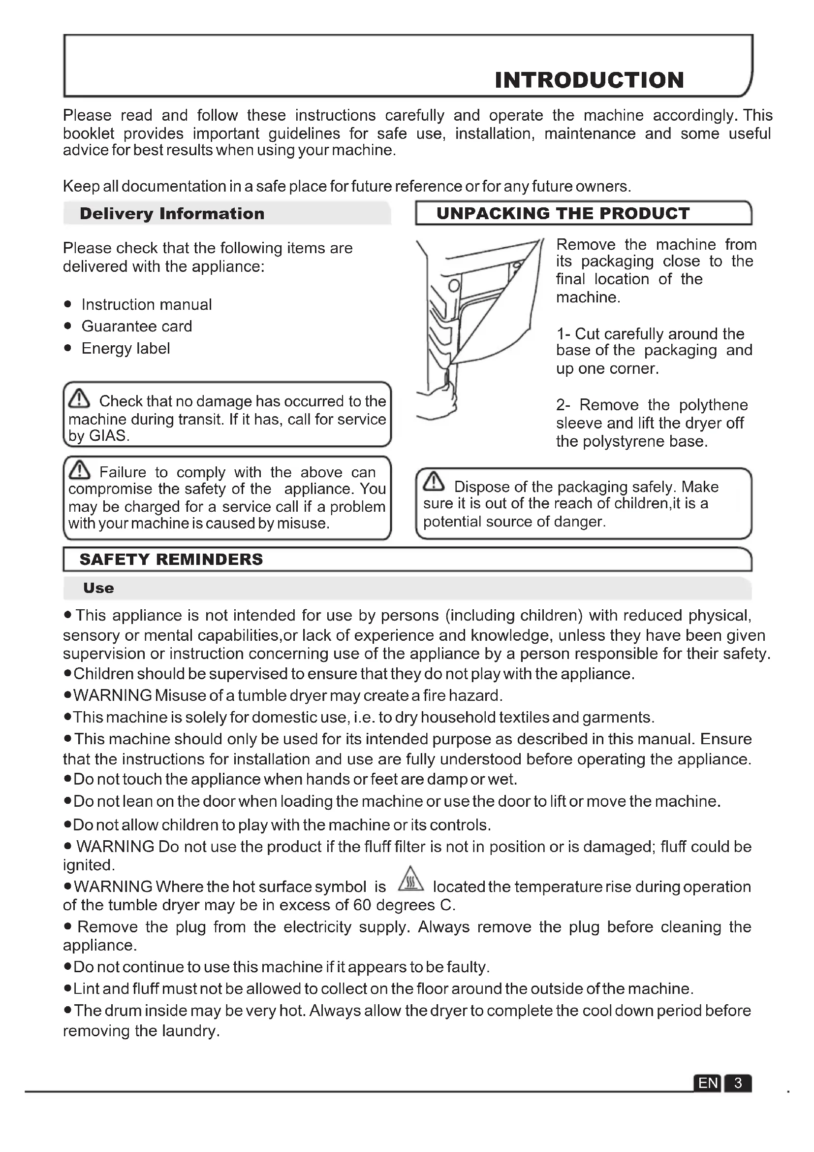 Dispose of the packaging safely. Make sure it is out of the reach of children,it is a potential source of danger. Failure to comply with the above can compromise the safety of the appliance. You may be charged for a service call if a problem with your machine is caused by misuse. Check that no damage has occurred to the machine during transit. If it has, call for service by GIAS. EN 3 SAFETY REMINDERS ● This appliance is not intended for use by persons (including children) with reduced physical, sensory or mental capabilities,or lack of experience and knowledge, unless they have been given supervision or instruction concerning use of the appliance by a person responsible for their safety. ● Children should be supervised to ensure that they do not play with the appliance. ● WARNING Misuse of a tumble dryer may create a fire hazard. ●This machine is solely for domestic use, i.e. to dry household textiles and garments. ●This machine should only be used for its intended purpose as described in this manual. Ensure that the instructions for installation and use are fully understood before operating the appliance. ● Do not touch the appliance when hands or feet are damp or wet. ● Do not lean on the door when loading the machine or use the door to lift or move the machine. ●Do not allow children to play with the machine or its controls. ● WARNING Do not use the product if the fluff filter is not in position or is damaged; fluff could be ignited. ● WARNING Where the hot surface symbol is located the temperature rise during operation of the tumble dryer may be in excess of 60 degrees C. ● Remove the plug from the electricity supply. Always remove the plug before cleaning the appliance. ● Do not continue to use this machine if it appears to be faulty. ● Lint and fluff must not be allowed to collect on the floor around the outside of the machine. ● The drum inside may be very hot. Always allow the dryer to complete the cool down period before removing the laundry.SAFETY REMINDERS EN 4 This appliance is marked according t o t h e E u r o p e a n d i r e c t i v e 2002/96/EC on Waste Electrical and Electronic Equipment (WEEE). By ensuring this product is disposed of correctly, you will help prevent potential negative consequences for the environment and human health, which could otherwise be caused by inappropriate waste handling of this product. The symbol on the product indicates that this product may not be treated as household waste. Instead it shall be handed over to the applicable collection point for the recycling of electrical and electronic equipment. For more detailed information about treatment, recovery and recycling of this product, please contact your local city office,your household waste disposal service or the shop where you purchased the product. Disposal must be carried out in accordance with local environmental regulations for waste disposal. European Directive 2002/96/EC ● To ensure the continued safe and efficient operation of this appliance we recommend that any servicing or repairs are only carried out by an authorised GIAS service engineer. GIAS Service If the appliance is not running properly or breaks down, switch it off and disconnect the plug from the socket. Consult GIAS Service for possible repair. ● All packaging materials used are environmentally-friendly and recyclable. Please help dispose of the packaging via environmentally-friendly means. Your local council will be able to give you details of current means of disposal. ● To ensure safety when disposing of an old tumble dryer disconnect the mains plug from the socket, cut the mains power cable and destroy this together with the plug. To prevent children shutting themselves in the machine break the door hinges or the door lock. Environmental Issues ● Check that the product has no visible signs of damage before use. If damaged do not use and please call GIAS Service. ● Do not use adapters, multiple connectors and/or extensions. ● Never install the dryer against curtains and be sure to prevent items from falling or collecting behind the dryer. ● The appliance must not be installed behind a lockable door, a sliding door or a door with a hinge on the opposite side to that of the tumble dryer. Installation ●Do not dry unwashed items in the tumble dryer. ● WARNING Do not tumble dry fabrics treated with dry cleaning fluids. ●WARNING Foam rubber materials can, under certain circumstances, when heated become ignited by spontaneous combustion. Items such as foam rubber (latex foam), shower caps, waterproof textiles, rubber backed articles and clothes or pillows fitted with foam rubber pads MUST NOT be dried in the tumble dryer. ● Always refer to the laundry care labels for directions on suitability for drying. ● Clothes should be spin dried or thoroughly wrung before they are put into the tumble dryer. Clothes that are dripping wet should not be put into the dryer. ● Lighters and matches must not be left in pockets and NEVER use flammable liquids near the machine. ● Glass fibre curtains should NEVER be put in this machine. Skin irritation may occur if other garments are contaminated with the glass fibres. ● Items that have been soiled with substances such as cooking oil, acetone, alcohol, petrol, kerosene, spot removers, turpentine, waxes and wax removers should be washed in hot water with an extra amount of detergent before being dried in the tumble dryer. ● Fabric softeners, or similar products, should be used as specified by the fabric softener instructions. The LaundryEN 5 INSTALLATION Tumble dryers are supplied to operate at a voltage of 230V, 50 Hz single phase. Check that the supply circuit is rated to at least 10A Electricity can be extremely dangerous. This appliance must be earthed. The socket outlet and the plug on the appliance must be of the same type. Do not use multiple adapters and/or extension leads. The plug should be accessible for disconnection aft