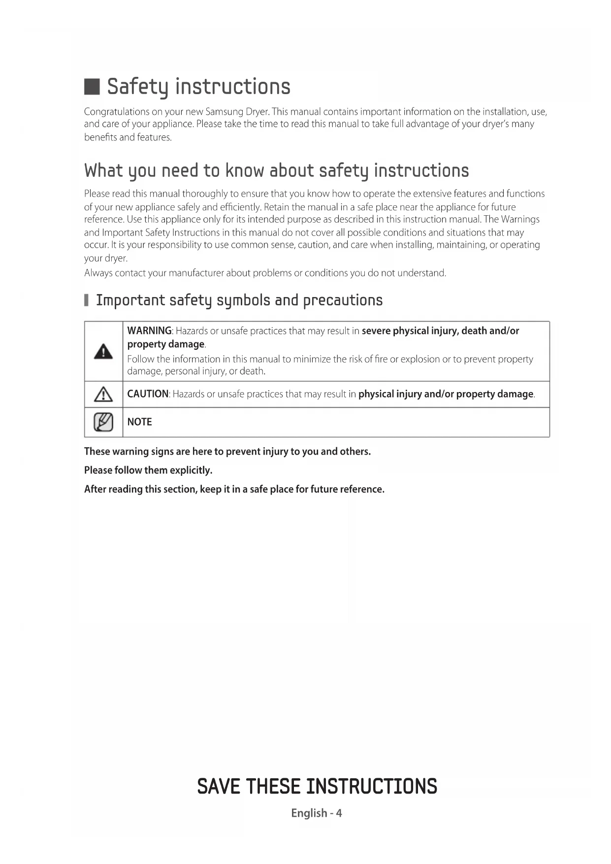 Safety instructions Congratulations on your new Samsung Dryer. This manual contains important information on the installation, use, and care of your appliance. Please take the time to read this manual to take full advantage of your dryer’s many benefits and features. What you need to know about safety instructions Please read this manual thoroughly to ensure that you know how to operate the extensive features and functions of your new appliance safely and efficiently. Retain the manual in a safe place near the appliance for future reference. Use this appliance only for its intended purpose as described in this instruction manual. The Warnings and Important Safety Instructions in this manual do not cover all possible conditions and situations that may occur. It is your responsibility to use common sense, caution, and care when installing, maintaining, or operating your dryer.Always contact your manufacturer about problems or conditions you do not understand. Important safety symbols and precautions WARNING: Hazards or unsafe practices that may result in severe physical injury, death and/or property damage.Follow the information in this manual to minimize the risk of fire or explosion or to prevent property damage, personal injury, or death. CAUTION: Hazards or unsafe practices that may result in physical injury and/or property damage. NOTE These warning signs are here to prevent injury to you and others.Please follow them explicitly.After reading this section, keep it in a safe place for future reference.DV6000HA_DC68-03380A-04_EN.indd 4 2014-11-25 4:46:52English - 5 01 SAFETY INSTRUCTIONS
