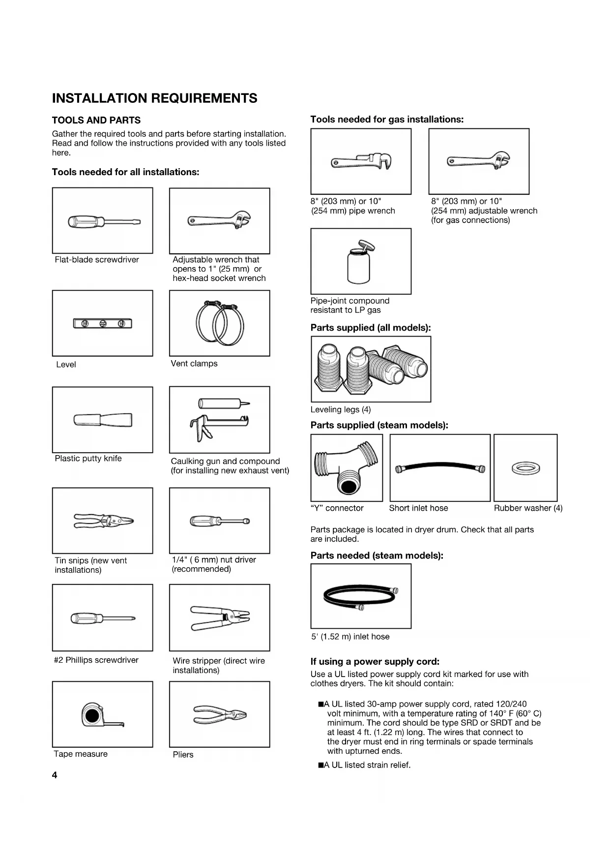 Gather the required tools and parts before starting installation. Read and follow the instructions provided with any tools listed here. Tools needed for all installations: Level #2 Phillips screwdriver Wire stripper (direct wire installations) Parts supplied (all models): Flat-blade screwdriver Adjustable wrench that opens to 1" (25 mm) or hex-head socket wrench Tin snips (new vent installations) Caulking gun and compound (for installing new exhaust vent) Vent clamps 1/4" ( 6 mm) nut driver (recommended) Tools needed for gas installations: 8" (203 mm) or 10" (254 mm) pipe wrench 8" (203 mm) or 10" (254 mm) adjustable wrench (for gas connections) Pipe-joint compound resistant to LP gas Plastic putty knife INSTALLATION REQUIREMENTS Leveling legs (4) Tape measure Pliers Parts supplied (steam models): “Y” connector Short inlet hose 5' (1.52 m) inlet hose Rubber washer (4) Parts needed (steam models): Parts package is located in dryer drum. Check that all parts are included. If using a power supply cord: Use a UL listed power supply cord kit marked for use with clothes dryers. The kit should contain: ■ A UL listed 30-amp power supply cord, rated 120/240 volt minimum, with a temperature rating of 140° F (60° C) minimum. The cord should be type SRD or SRDT and be at least 4 ft. (1.22 m) long. The wires that connect to the dryer must end in ring terminals or spade terminals with upturned ends. ■ A UL listed strain relief.5 Parts needed: (Not supplied with dryer) Check local codes. Check existing electrical supply and venting. See “Electrical Requirements” and “Venting Requirements” before purchasing parts. Mobile home installations require metal exhaust system hardware available for purchase from the dealer from whom you purchased your dryer. For further information, please refer to the “Assistance or Service” section in your “Use and Care Guide.” LOCATION REQUIREMENTS You will need: ■ A location allowing for proper exhaust installation. See “Venting Requirements.” ■ A separate 15 or 20-amp circuit needed for gas dryers and 30-amp circuit needed for electric dryers. ■ If using power supply cord, a grounded electrical outlet located within 2 ft. (610 mm) of either side of dryer. See “Electrical Requirements.” ■ Floor must support dryer weight of 200 lbs. (90.7 kg). Also consider weight of companion appliance. ■ Level oor with maximum slope of 1" (25 mm) under entire dryer. If slope is greater than 1" (25 mm), clothes may not tumble properly and automatic sensor cycles may not operate correctly. ■ For garage installation, place dryer at least 18" (460 mm) above oor. ■ Steam models only: Cold water faucets located within 4 ft. (1.2 m) of the water ll valves, and water pressure of 20-100 psi (137.9-689.6 kPa). You may use the water supply for your washer using the “Y” connector and short hose which are provided. IMPORTANT: Do not operate, install, or store dryer where it will be exposed to water, weather, or at temperatures below 45° F (7° C). Lower temperatures may cause dryer not to shut off at end of automatic sensor cycles, resulting in longer drying times. NOTE: No other fuel-burning appliance can be installed in the same closet as a dryer. DRYER DIMENSIONS INSTALLATION CLEARANCES For each arrangement, consider allowing more space for ease of installation and servicing, spacing for companion appliances and clearances for walls, doors, and oor moldings. Space must be large enough to allow door to fully open. Add spacing on all sides of dryer to reduce noise transfer. If a closet door or louvered door is installed, top and bottom air openings in door are required. Check code requirements. Some codes limit, or do not permit, installation of the dryer in garages, closets, mobile homes, or sleeping quarters. Contact your local building inspector. NOTE: Most installations require a minimum of 6" (152 mm) clearance behind dryer for exhaust vent with elbow. See “Venting Requirements.” Bottom view: