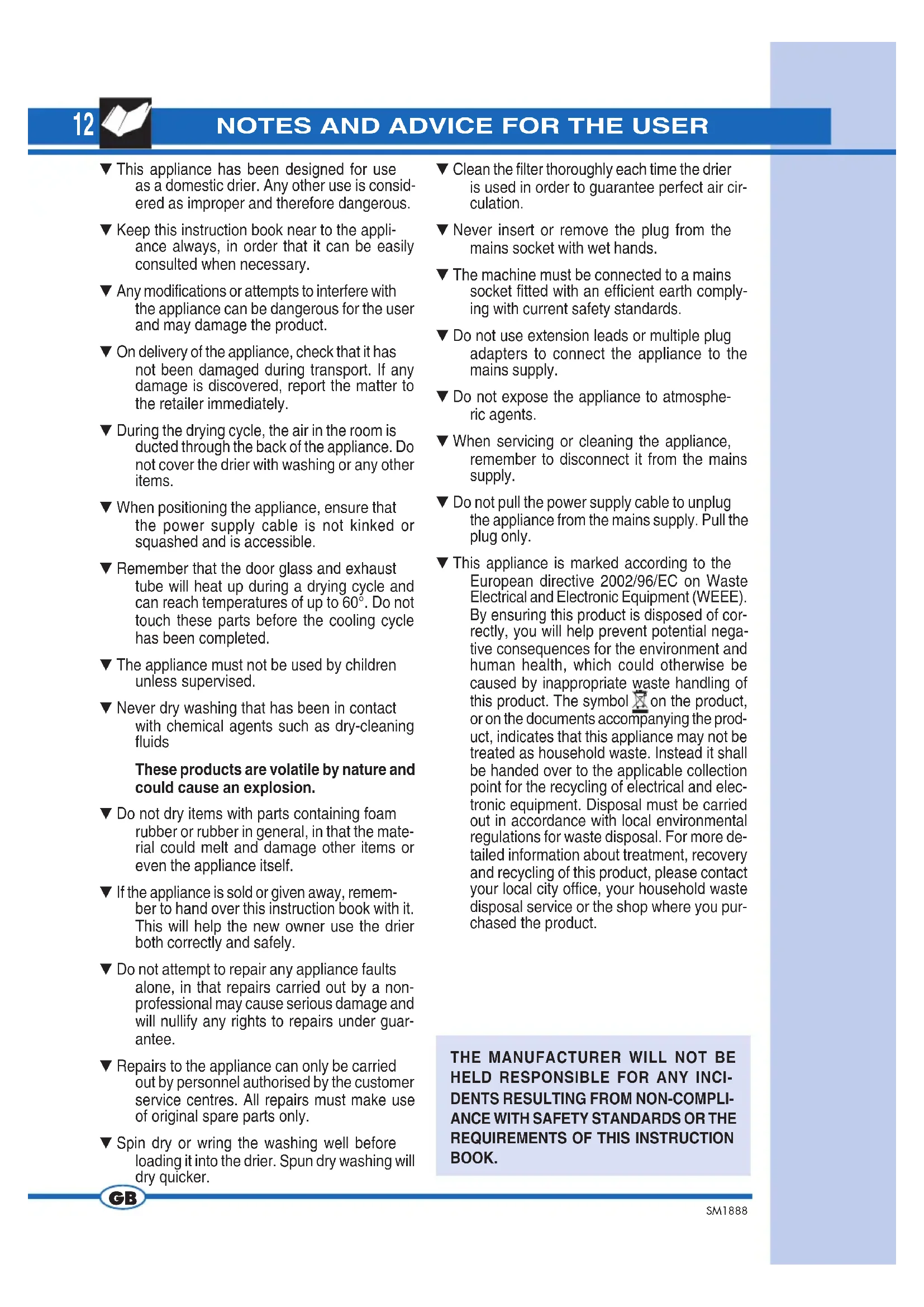 ▼ This appliance has been designed for use as a domestic drier. Any other use is consid- ered as improper and therefore dangerous. ▼ Keep this instruction book near to the appli- ance always, in order that it can be easily consulted when necessary. ▼ Any modifications or attempts to interfere with the appliance can be dangerous for the user and may damage the product. ▼ On delivery of the appliance, check that it has not been damaged during transport. If any damage is discovered, report the matter to the retailer immediately. ▼ During the drying cycle, the air in the room is ducted through the back of the appliance. Do not cover the drier with washing or any other items. ▼ When positioning the appliance, ensure that the power supply cable is not kinked or squashed and is accessible. ▼ Remember that the door glass and exhaust tube will heat up during a drying cycle and can reach temperatures of up to 60°. Do not touch these parts before the cooling cycle has been completed. ▼ The appliance must not be used by children unless supervised. ▼ Never dry washing that has been in contact with chemical agents such as dry-cleaning fluids These products are volatile by nature and could cause an explosion. ▼ Do not dry items with parts containing foam rubber or rubber in general, in that the mate- rial could melt and damage other items or even the appliance itself. ▼ If the appliance is sold or given away, remem- ber to hand over this instruction book with it. This will help the new owner use the drier both correctly and safely. ▼ Do not attempt to repair any appliance faults alone, in that repairs carried out by a non- professional may cause serious damage and will nullify any rights to repairs under guar- antee. ▼ Repairs to the appliance can only be carried out by personnel authorised by the customer service centres. All repairs must make use of original spare parts only. ▼ Spin dry or wring the washing well before loading it into the drier. Spun dry washing will dry quicker. ▼ Clean the filter thoroughly each time the drier is used in order to guarantee perfect air cir- culation. ▼ Never insert or remove the plug from the mains socket with wet hands. ▼ The machine must be connected to a mains socket fitted with an efficient earth comply- ing with current safety standards. ▼ Do not use extension leads or multiple plug adapters to connect the appliance to the mains supply. ▼ Do not expose the appliance to atmosphe- ric agents. ▼ When servicing or cleaning the appliance, remember to disconnect it from the mains supply. ▼ Do not pull the power supply cable to unplug the appliance from the mains supply. Pull the plug only. ▼ This appliance is marked according to the European directive 2002/96/EC on Waste Electrical and Electronic Equipment (WEEE). By ensuring this product is disposed of cor- rectly, you will help prevent potential nega- tive consequences for the environment and human health, which could otherwise be caused by inappropriate waste handling of this product. The symbol on the product, or on the documents accompanying the prod- uct, indicates that this appliance may not be treated as household waste. Instead it shall be handed over to the applicable collection point for the recycling of electrical and elec- tronic equipment. Disposal must be carried out in accordance with local environmental regulations for waste disposal. For more de- tailed information about treatment, recovery and recycling of this product, please contact your local city office, your household waste disposal service or the shop where you pur- chased the product.