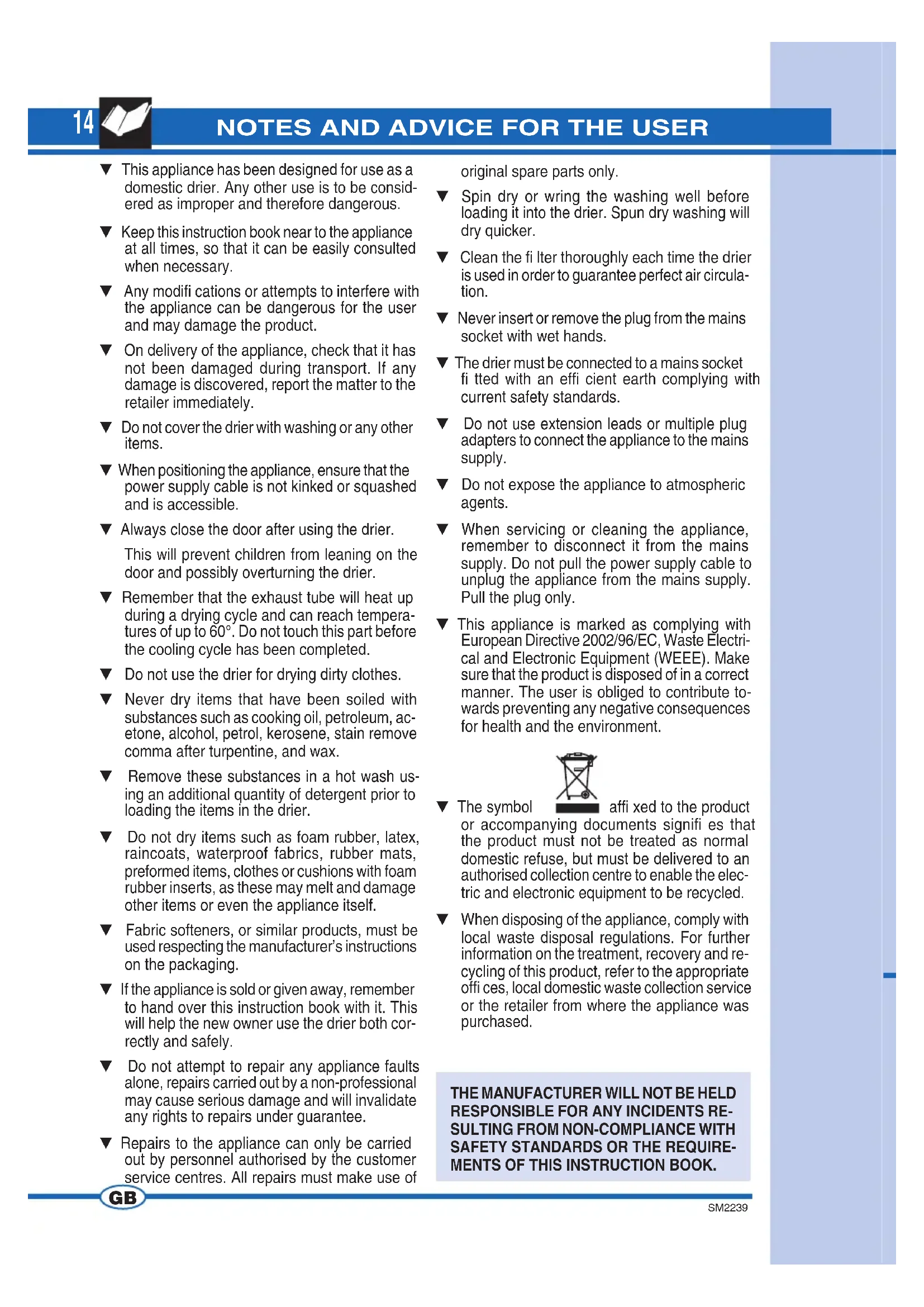 ▼ This appliance has been designed for use as a domestic drier. Any other use is to be consid- ered as improper and therefore dangerous. ▼ Keep this instruction book near to the appliance at all times, so that it can be easily consulted when necessary. ▼ Any modifi cations or attempts to interfere with the appliance can be dangerous for the user and may damage the product. ▼ On delivery of the appliance, check that it has not been damaged during transport. If any damage is discovered, report the matter to the retailer immediately. ▼ Do not cover the drier with washing or any other items. ▼ When positioning the appliance, ensure that the power supply cable is not kinked or squashed and is accessible. ▼ Always close the door after using the drier. This will prevent children from leaning on the door and possibly overturning the drier. ▼ Remember that the exhaust tube will heat up during a drying cycle and can reach tempera- tures of up to 60°. Do not touch this part before the cooling cycle has been completed. ▼ Do not use the drier for drying dirty clothes. ▼ Never dry items that have been soiled with substances such as cooking oil, petroleum, ac- etone, alcohol, petrol, kerosene, stain remove comma after turpentine, and wax. ▼ Remove these substances in a hot wash us- ing an additional quantity of detergent prior to loading the items in the drier. ▼ Do not dry items such as foam rubber, latex, raincoats, waterproof fabrics, rubber mats, preformed items, clothes or cushions with foam rubber inserts, as these may melt and damage other items or even the appliance itself. ▼ Fabric softeners, or similar products, must be used respecting the manufacturer’s instructions on the packaging. ▼ If the appliance is sold or given away, remember to hand over this instruction book with it. This will help the new owner use the drier both cor- rectly and safely. ▼ Do not attempt to repair any appliance faults alone, repairs carried out by a non-professional may cause serious damage and will invalidate any rights to repairs under guarantee. ▼ Repairs to the appliance can only be carried out by personnel authorised by the customer service centres. All repairs must make use of original spare parts only. ▼ Spin dry or wring the washing well before loading it into the drier. Spun dry washing will dry quicker. ▼ Clean the fi lter thoroughly each time the drier is used in order to guarantee perfect air circula- tion. ▼ Never insert or remove the plug from the mains socket with wet hands. ▼ The drier must be connected to a mains socket fi tted with an effi cient earth complying with current safety standards. ▼ Do not use extension leads or multiple plug adapters to connect the appliance to the mains supply. ▼ Do not expose the appliance to atmospheric agents. ▼ When servicing or cleaning the appliance, remember to disconnect it from the mains supply. Do not pull the power supply cable to unplug the appliance from the mains supply. Pull the plug only. ▼ This appliance is marked as complying with European Directive 2002/96/EC, Waste Electri- cal and Electronic Equipment (WEEE). Make sure that the product is disposed of in a correct manner. The user is obliged to contribute to- wards preventing any negative consequences for health and the environment. ▼ The symbol affi xed to the product or accompanying documents signifi es that the product must not be treated as normal domestic refuse, but must be delivered to an authorised collection centre to enable the elec- tric and electronic equipment to be recycled. ▼ When disposing of the appliance, comply with local waste disposal regulations. For further information on the treatment, recovery and re- cycling of this product, refer to the appropriate offi ces, local domestic waste collection service or the retailer from where the appliance was purchased.