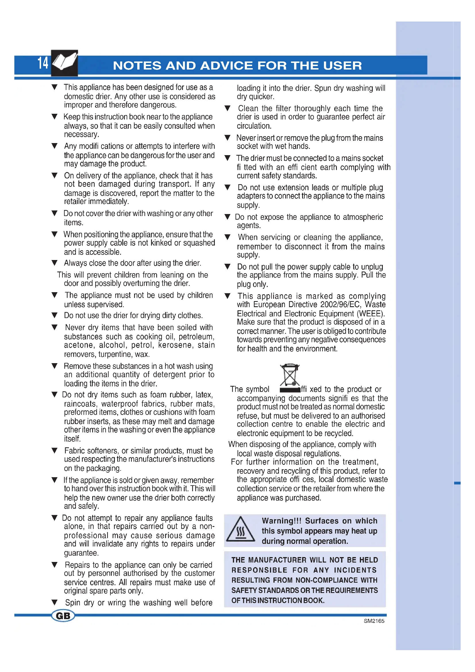 SM2165 NOTE13 SM2165 CONTENTS MODEL: ................................................................................................................................................................................................................... SERIAL NUMBER: ......................................................................................................................................................................................... DATE OF PURCHASE: ................................................................................................................................................................................ ENGLISH Dear Customer, Thank you for choosing our product. Please read these instructions carefully before connecting and using the appliance. Knowledge of the operating principles will help guarantee correct and safe use of the appliance. This instruction booklet contains the technical characteristics of the drier and is full of useful infor- mation regarding its operation, all designed to help you get the best out of your appliance. If the appliance is sold or handed over for use by others, remember to give the new user the instruction booklet.