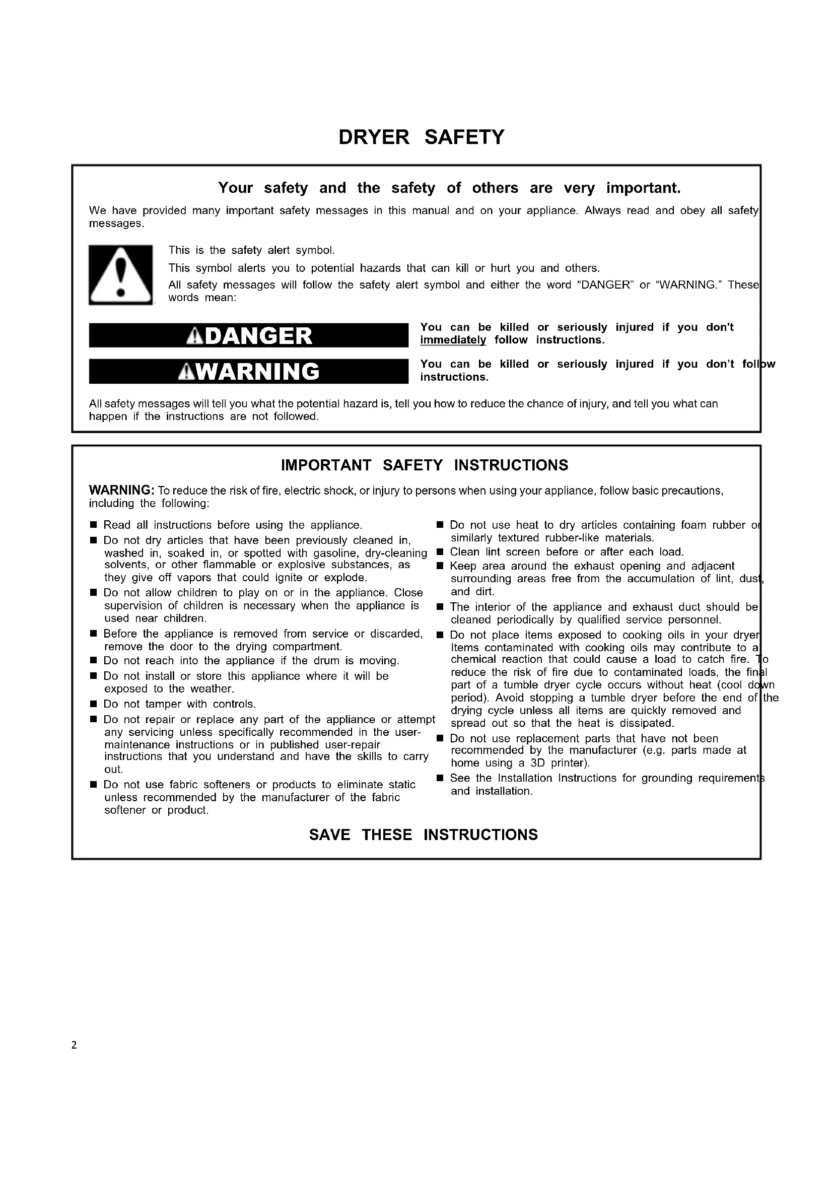 ■ Do not dry articles that have been previously cleaned in, washed in, soaked in, or spotted with gasoline, dry-cleaning solvents, or other flammable or explosive substances, as they give off vapors that could ignite or explode.