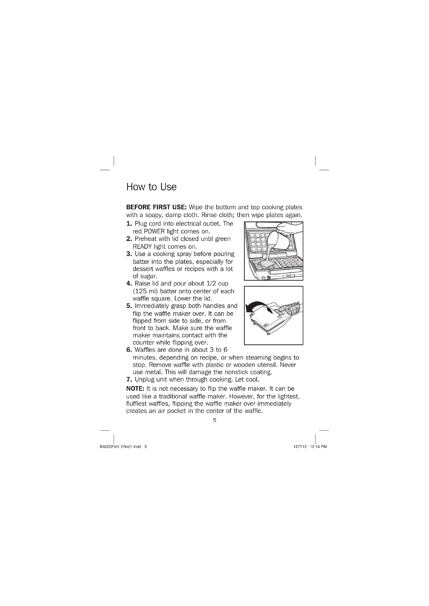 NOTE: It is not necessary to flip the waffle maker. It can be used like a traditional waffle maker. However, for the lightest, fluffiest waffles, flipping the waffle maker over immediately creates an air pocket in the center of the waffle. 840222101 ENv01.indd 5840222101 ENv01.indd 5 12/7/12 12:14 PM12/7/12 12:14 PM6 POWER and READY Lights Waffle Maker Tips The red POWER light comes on when the waffle maker is first plugged in. This light will stay on until the unit is unplugged. The green READY light comes on when the waffle maker has reached the desired temperature. For best results, wait until the READY light comes on before adding the waffle batter.