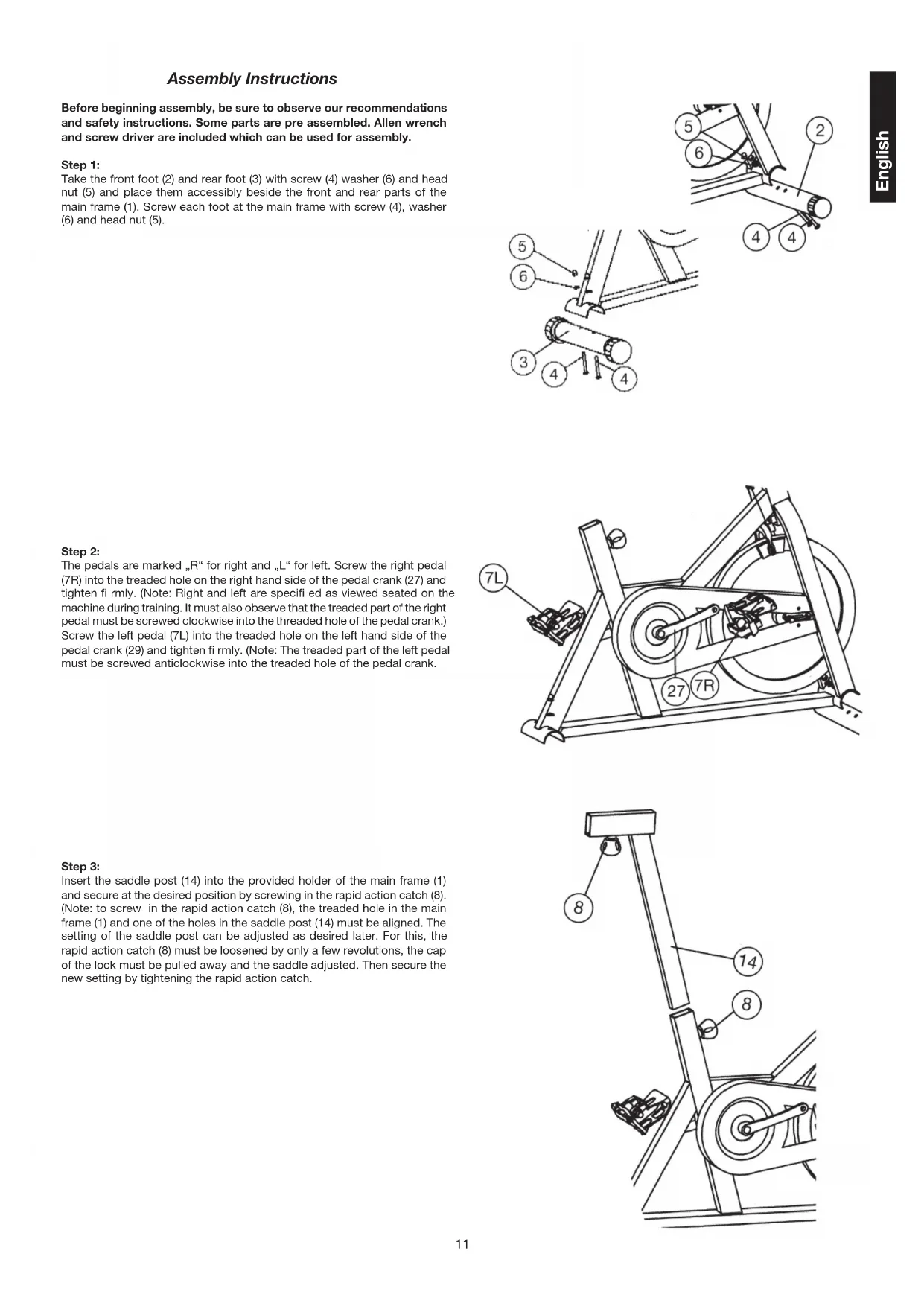with the machine. Your clothes must be such that they cannot catch dur-ing training due to their shape (e.g. length). Your training shoes should be appropriate for the trainer, must support your feet fi rmly and must have non-slip soles. 12. If you notice a feeling of dizziness, sickness, chest pain or other abnormal symptoms, stop training and consult a doctor.13. Never forget that sports machines are not toys. They must therefore only be used according to their purpose and by suitably informed and instructed persons. 14. People such as children, invalids and handicapped persons should only use the machine in the presence of another person who can give aid and advice. Take suitable measures to ensure that children never use the machine without supervision.15. Ensure that the person conducting training and other people never move or hold any parts of their body into the vicinity of moving parts.16. At the end of its life span this product is not allowed to dispose over the normal household waste, but it must be given to an assembly point for the recycling of electric and electronic components. You may fi nd the symbol on the product, on the instructions or on the packing. The materials are reusable in accordance with their marking. With the re-use, the material utilization or the protection of our environment. Please ask the local administration for the responsible disposal place.17. To protect the environment, do not dispose of the packaging materials, used batteries or parts of the machine as household waste. Put these in the appropriate collection bins or bring them to a suitable collection point.18. This machine is a speed-dependant machine, i.e. the power increases with increasing speed, and the reverse.19. The machine is equipped with infi nitely adjustable resistance which al-lows the braking resistance and thereby the training exertion to be reduced or increased. Turning the adjusting knob for the resistance setting towards the minus sign reduces the braking resistance and thereby the training exertion. Turning the adjusting knob for the resistance setting towards the plus sign increases the braking resistance and thereby the training exertion.20. The maximum permissible load (=body weight) is specifi ed as 150 kg. English10 Please check after opening the packing that all the parts shown in the following parts lists are there. Once you are sure that this is the case, you can start assembly. Please contact us if any components are defective or missing, or if you need any spare parts or replacements in future. Parts List – Spare Parts List XL 1 Order No. 9810 Technical data: Issue: 01. 03. 2008 Infi nitely adjustable calliper brake 19 kg centrifugal mass Horizontally and vertically adjustable racing saddle Vertically adjustable racing handlebars Easy to use computer with digital display of: time, speed, distance, approx. calorie consumption and scan. Space requirement approx. L 105, W 50, H 122 cm Illustration Designation Dimensions Quantity Attached to ET number No. mm illustration No. 1 Main frame 1 33-9810-01-SW 2 Front foot 1 1 33-9810-02-SW 3 Rear Foot 1 1 33-9810-03-SW 4 Carriage bolt M8 x 70 4 1+2+3 36-9810-01-BT 5 Head nut M8 4 2+3 36-9810-02-BT 6 Washer curved for M8 4 4 36-9810-03-BT 7L Pedal left 1 29 36-9810-04-BT 7R Pedal right 1 27 36-9810-05-BT 8 Rapid action catch 3 1+14 36-9810-06-BT 9 Handlebar post 1 1 33-9810-04-CR 10 Saddle slide 1 14 33-9810-05-CR 11 Saddle 1 10 36-9810-07-BT 12 Handlebar 1 9 33-9810-06-CR 13 Wrapping long Ø 25 x 360mm 2 12 36-9810-08-BT 14 Sadlle post 1 1 33-9810-07-CR 15 Screw M8 x 15 4 1+9 39-9888-CR 16 Wrapping short Ø 25 x 300mm 2 12 36-9810-09-BT 17 Washer for M8 4 15 39-10018-CR 18 Eccentic cap Ø 2 1/4“ 2 3 36-9810-10-BT 19 Foot cap Ø 2 1/4“ 2 2 36-9810-11-BT 20 Transport roller unit Ø 40mm 2 2 36-9810-12-BT 21 Flywheel 1 1 33-9810-08-CR 22 Plastic slide 30 x 60mm 3 1+14 36-9810-13-BT 23 Break lining 2 1 36-9810-14-BT 24 Emergency break 1 25 36-9810-15-BT 25 Resistance adjusting 1 1 36-9810-16-BT 26 Chain cover 1 1 33-9810-04-SW 27 Spur gear incl. Right pedal arm 52 Z 1 30 33-9810-05-SW 28 Chain tensioner M6 x 40 2 34 39-10172 29 Pedal arm left 1 30 33-9810-06-SW 30 Pedal axle 1 31 33-9810-07-SW 31 Bearing (pedal crank) 6203 Z 2 1+30 36-9810-17-BT 32 Chain 27 x 52 1 21+27 36-9810-18-BT 33 Bearing (Flywheel) 6000 Z 2 21 36-9810-19-BT 34 Flywheel axle 1 33 36-9810-20-BT 35 Bottle holder 1 1 33-9710-12-SW 36 Drink bottle 1 35 36-9710-31-BT 37 Computer holder 1 12 36-9810-24-BT 38 Sensor cable 1 21 36-9810-25-BT 39 Computer 1 37 36-9810-26-BT 40 Freewheel 16 Z 1 21 36-9810-27-BT 41 Carton 1 36-9810-21-BT 42 Assembly and exercise instructions 1 36-9810-22-BT 43 Tool Set 1 36-9810-23-BT Adresse: Top-Sports Gilles GmbH Friedrichstr. 55 42551 Velbert Telefon: +49 (0 ) 20 51) 6067-0 Telefax: +49 (0 ) 20 51) 6067-44 e-mail: info@christopeit-sport.com www.christopeit-sport.com11 English Assembly Instructions Before beginning assembly, be sure to observe our recommendations and safety instructions. Some parts are pre assembled. Allen wrench and screw driver are included which can be used for assembly. Step 1: Take the front foot (2) and rear foot (3) with screw (4) washer (6) and head nut (5) and place them accessibly beside the front and rear parts of the main frame (1). Screw each foot at the main frame with screw (4), washer (6) and head nut (5). Step 3: Insert the saddle post (14) into the provided holder of the main frame (1) and secure at the desired position by screwing in the rapid action catch (8). (Note: to screw in the rapid action catch (8), the treaded hole in the main frame (1) and one of the holes in the saddle post (14) must be aligned. The setting of the saddle post can be adjusted as desired later. For this, the rapid action catch (8) must be loosened by only a few revolutions, the cap of the lock must be pulled away and the saddle adjusted. Then secure the new setting by tightening the rapid action catch. Step 2: The p