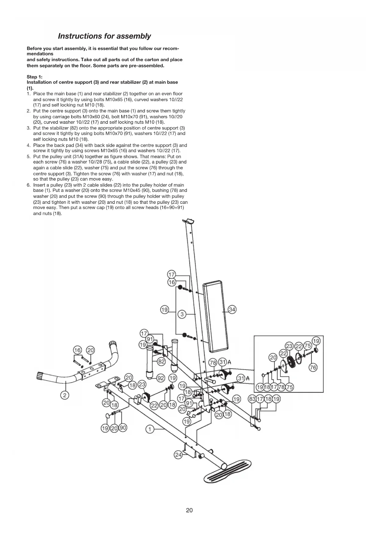 base (1). Put a washer (20) onto the screw M10x45 (90), bushing (78) and washer (20) and put the screw (90) through the pulley holder with pulley (23) and tighten it with washer (20) and nut (18) so that the pulley (23) can move easy. Then put a screw cap (19) onto all screw heads (16+90+91) and nuts (18).21 English Step 2: Installation of weight plates (37+40) and guide bars (5).