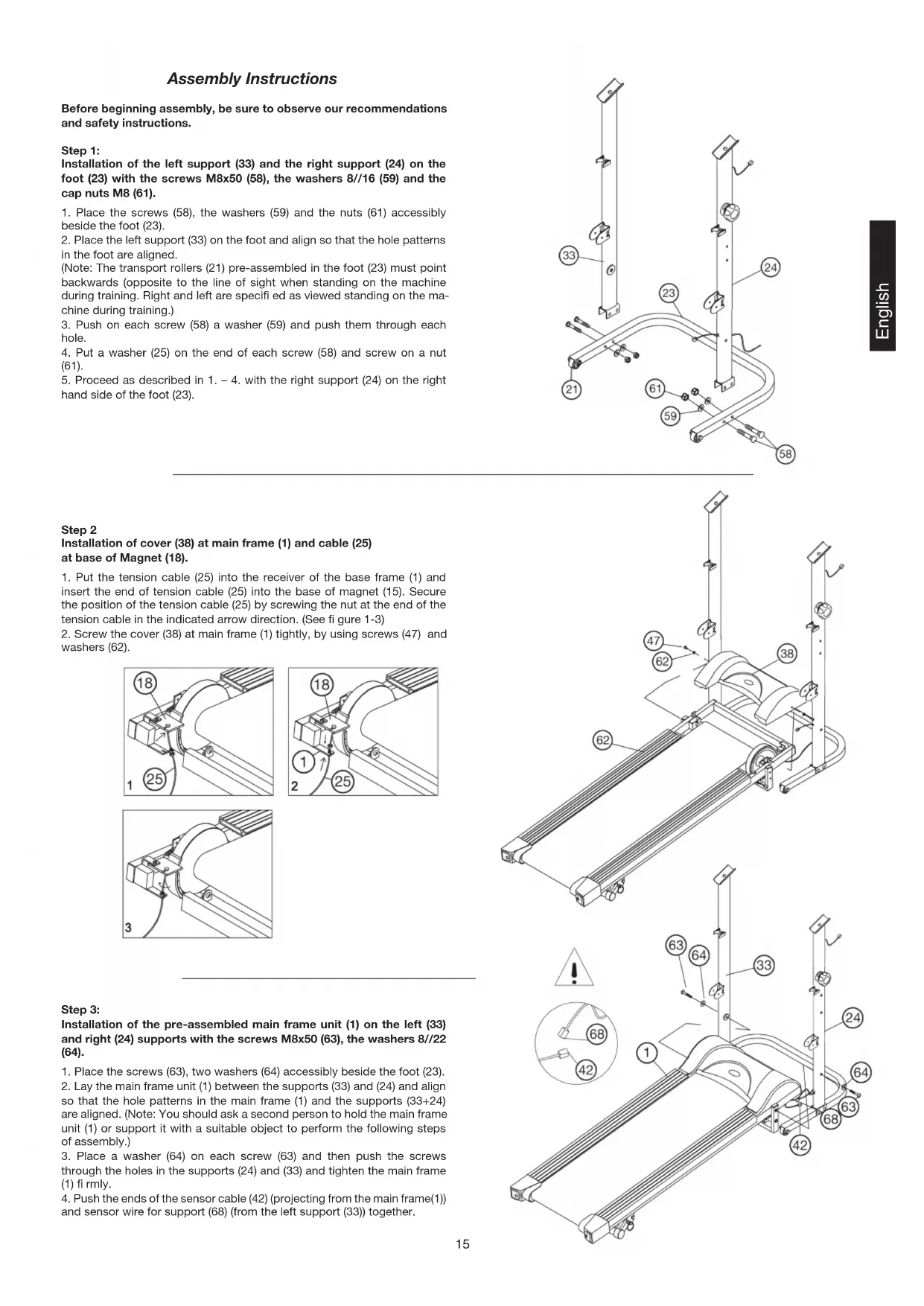 (Note: The transport rollers (21) pre-assembled in the foot (23) must point backwards (opposite to the line of sight when standing on the machine during training. Right and left are specified as viewed standing on the machine during training.) - Push on each screw (58) a washer (59) and push them through each hole.