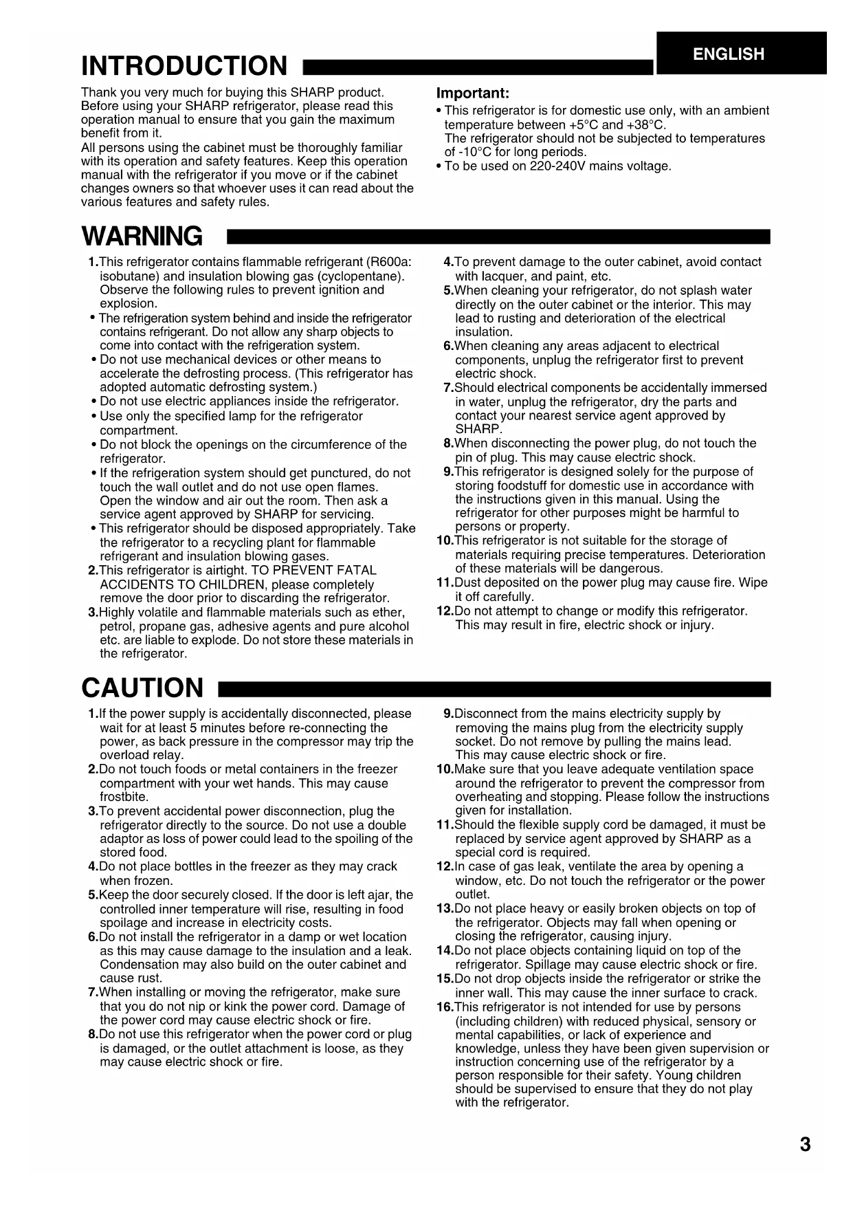 - This refrigerator is for domestic use only, with an ambient temperature between +5°C and +38°C. The refrigerator should not be subjected to temperatures of -10°C for long periods.• To be used on 220-240V mains voltage. WARNING 1.This refrigerator contains flammable refrigerant (R600a: isobutane) and insulation blowing gas (cyclopentane). Observe the following rules to prevent ignition and explosion. • The refrigeration system behind and inside the refrigerator contains refrigerant. Do not allow any sharp objects to come into contact with the refrigeration system. • Do not use mechanical devices or other means to accelerate the defrosting process. (This refrigerator has adopted automatic defrosting system.) • Do not use electric appliances inside the refrigerator. • Use only the specified lamp for the refrigerator compartment. • Do not block the openings on the circumference of the refrigerator. • If the refrigeration system should get punctured, do not touch the wall outlet and do not use open flames. Open the window and air out the room. Then ask a service agent approved by SHARP for servicing. • This refrigerator should be disposed appropriately. Take the refrigerator to a recycling plant for flammable refrigerant and insulation blowing gases. 2.This refrigerator is airtight. TO PREVENT FATAL ACCIDENTS TO CHILDREN, please completely remove the door prior to discarding the refrigerator. 3.Highly volatile and flammable materials such as ether, petrol, propane gas, adhesive agents and pure alcohol etc. are liable to explode. Do not store these materials in the refrigerator. 4.To prevent damage to the outer cabinet, avoid contact with lacquer, and paint, etc. 5.When cleaning your refrigerator, do not splash water directly on the outer cabinet or the interior. This may lead to rusting and deterioration of the electrical insulation. 6.When cleaning any areas adjacent to electrical components, unplug the refrigerator first to prevent electric shock. 7.Should electrical components be accidentally immersed in water, unplug the refrigerator, dry the parts and contact your nearest service agent approved by SHARP. 8.When disconnecting the power plug, do not touch the pin of plug. This may cause electric shock. 9.This refrigerator is designed solely for the purpose of storing foodstuff for domestic use in accordance with the instructions given in this manual. Using the refrigerator for other purposes might be harmful to persons or property.10.This refrigerator is not suitable for the storage of materials requiring precise temperatures. Deterioration of these materials will be dangerous.11.Dust deposited on the power plug may cause fire. Wipe it off carefully.12.Do not attempt to change or modify this refrigerator. This may result in fire, electric shock or injury. CAUTION 1.If the power supply is accidentally disconnected, please wait for at least 5 minutes before re-connecting the power, as back pressure in the compressor may trip the overload relay. 2.Do not touch foods or metal containers in the freezer compartment with your wet hands. This may cause frostbite. 3.To prevent accidental power disconnection, plug the refrigerator directly to the source. Do not use a double adaptor as loss of power could lead to the spoiling of the stored food. 4.Do not place bottles in the freezer as they may crack when frozen. 5.Keep the door securely closed. If the door is left ajar, the controlled inner temperature will rise, resulting in food spoilage and increase in electricity costs. 6.Do not install the refrigerator in a damp or wet location as this may cause damage to the insulation and a leak. Condensation may also build on the outer cabinet and cause rust. 7.When installing or moving the refrigerator, make sure that you do not nip or kink the power cord. Damage of the power cord may cause electric shock or fire. 8.Do not use this refrigerator when the power cord or plug is damaged, or the outlet attachment is loose, as they may cause electric shock or fire. 9.Disconnect from the mains electricity supply by removing the mains plug from the electricity supply socket. Do not remove by pulling the mains lead. This may cause electric shock or fire.10.Make sure that you leave adequate ventilation space around the refrigerator to prevent the compressor from overheating and stopping. Please follow the instructions given for installation.11.Should the flexible supply cord be damaged, it must be replaced by service agent approved by SHARP as a special cord is required.12.In case of gas leak, ventilate the area by opening a window, etc. Do not touch the refrigerator or the power outlet.13.Do not place heavy or easily broken objects on top of the refrigerator. Objects may fall when opening or closing the refrigerator, causing injury.14.Do not place objects containing liquid on top of the refrigerator. Spillage may cause electric shock or fire.15.Do not drop objects inside the refrigerator or strike the inner wall. This may cause the inner surface to crack.16.This refrigerator is not intended for use by persons (including children) with reduced physical, sensory or mental capabilities, or lack of experience and knowledge, unless they have been given supervision or instruction concerning use of the refrigerator by a person responsible for their safety. Young children should be supervised to ensure that they do not play with the refrigerator. (A808-3 校 )_03-10_ENG.fm Page 3 Monday, June 16, 2008 1:35 PM4 INSTALLATION