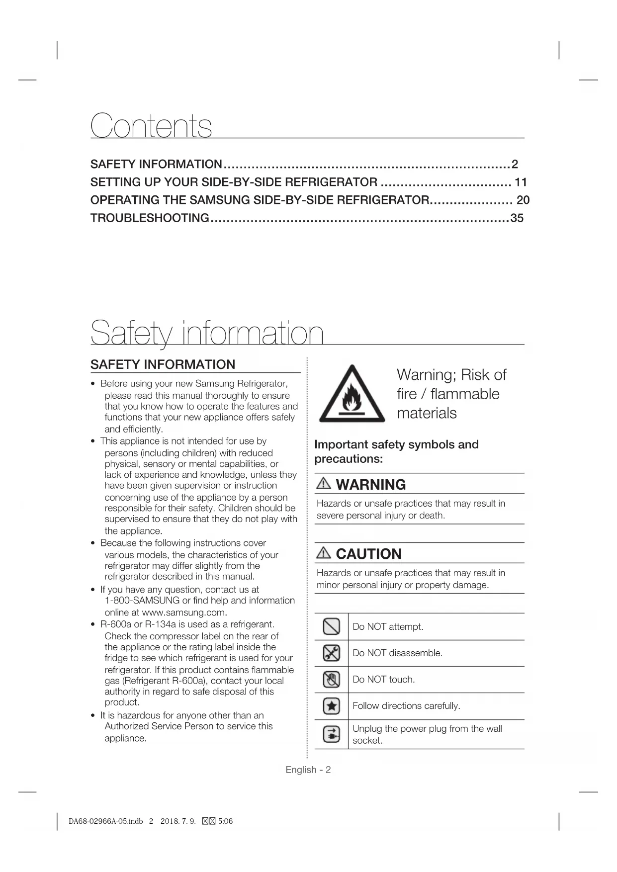 - Before using your new Samsung Refrigerator, please read this manual thoroughly to ensure that you know how to operate the features and functions that your new appliance offers safely and efficiently.• This appliance is not intended for use by persons (including children) with reduced physical, sensory or mental capabilities, or lack of experience and knowledge, unless they have been given supervision or instruction concerning use of the appliance by a person responsible for their safety. Children should be supervised to ensure that they do not play with the appliance.• Because the following instructions cover various models, the characteristics of your refrigerator may differ slightly from the refrigerator described in this manual.• If you have any question, contact us at 1-800-SAMSUNG or find help and information online at www.samsung.com.• R-600a or R-134a is used as a refrigerant. Check the compressor label on the rear of the appliance or the rating label inside the fridge to see which refrigerant is used for your refrigerator. If this product contains flammable gas (Refrigerant R-600a), contact your local authority in regard to safe disposal of this product.• It is hazardous for anyone other than an Authorized Service Person to service this appliance. Warning; Risk of fire / flammable materials Important safety symbols and precautions: WARNING Hazards or unsafe practices that may result in severe personal injury or death. CAUTION Hazards or unsafe practices that may result in minor personal injury or property damage.Do NOT attempt.Do NOT disassemble.Do NOT touch.Follow directions carefully.Unplug the power plug from the wall socket. Contents SAFETY INFORMATION ……………………………………………………………… 2
