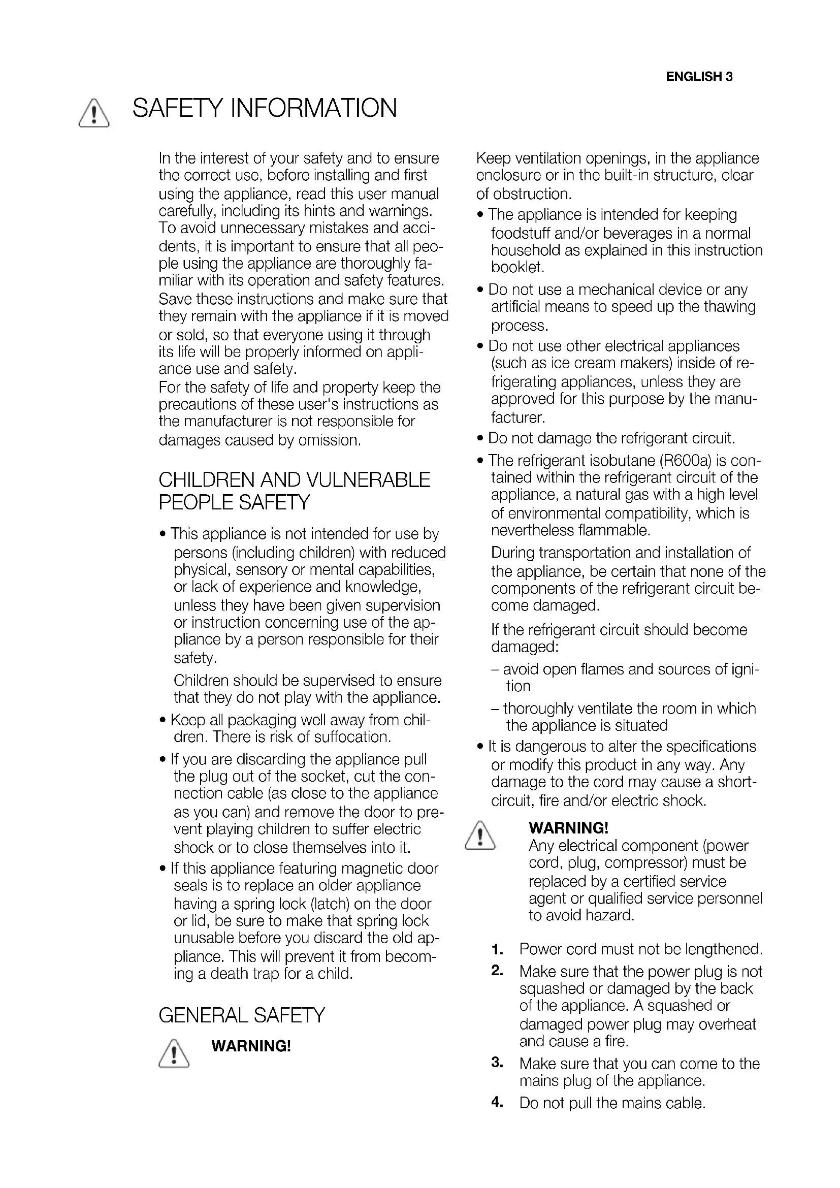 - If this appliance featuring magnetic door seals is to replace an older appliance having a spring lock (latch) on the door or lid, be sure to make that spring lock unusable before you discard the old ap- pliance. This will prevent it from becom- ing a death trap for a child. GENERAL SAFETY WARNING! Keep ventilation openings, in the appliance enclosure or in the built-in structure, clear of obstruction.
